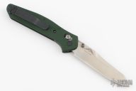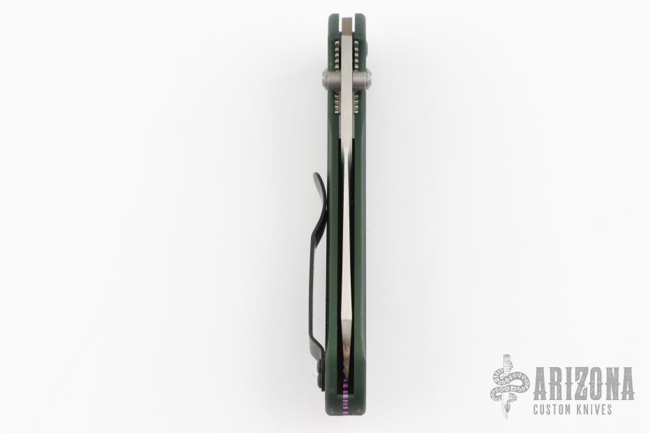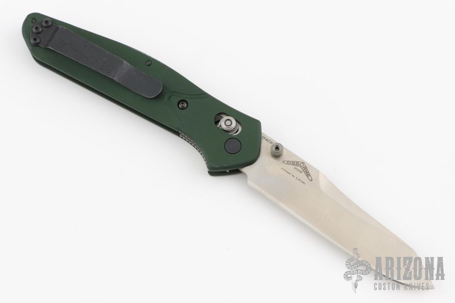 This Benchmade Osborne 940 features a satin finished clip point blade with swedge and dual thumb studs. The handle is comprised of a machined and green anodized aluminum frame over jimped and purple anodized titanium backspacer. The black coated, steel tip up clip is reversible for right or left hand carry. Comes with original box and papers. Has some scratches on the clip and some light scuffs on the body. Excellent condition.