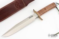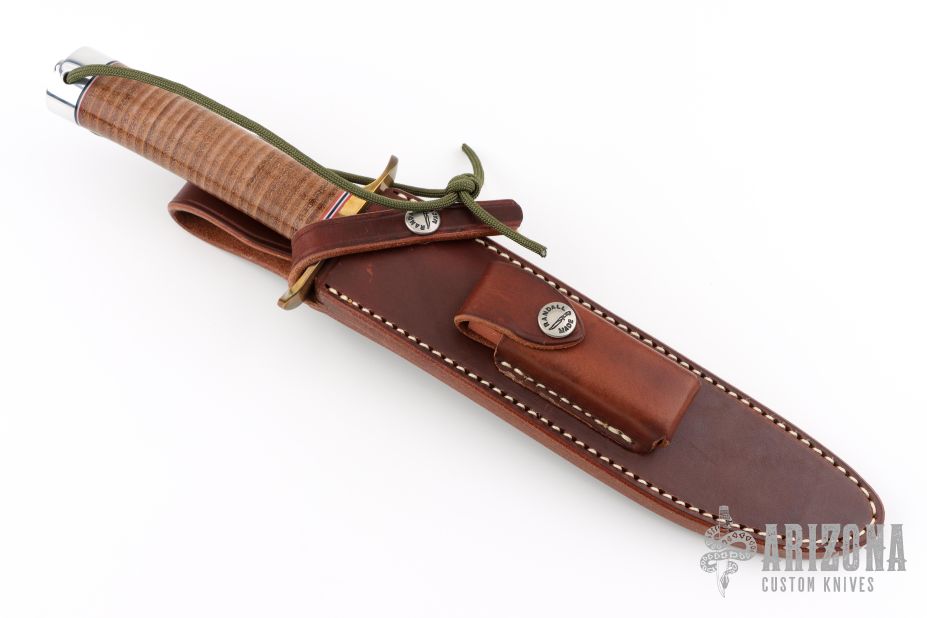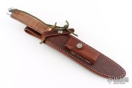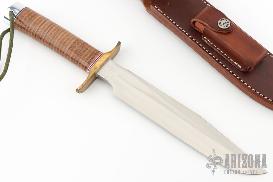 "The Model 1 by Randall Made Knives was made famous by Allied combat troops in World War II and has since been widely used in all theaters of war." This knife features a satin finished blade with a sharpened top edge, .235" blade stock and 1.328" blade depth, hidden tang construction. Brass guard, stacked leather handle with red/white/blue spacers, and a duralumin butt cap with lanyard hole. Includes a brown leather sheath and a Randall zippered case. Excellent condition.