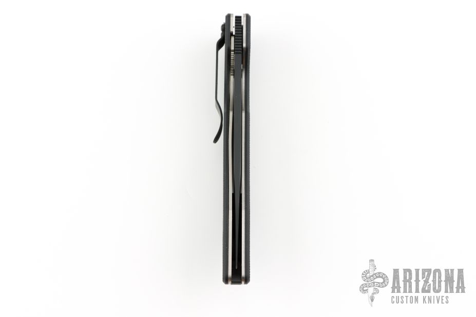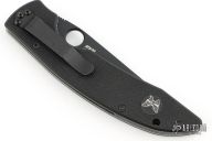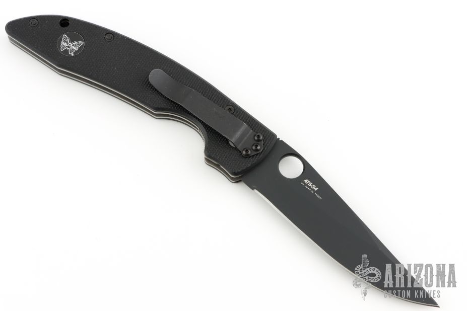 This 800BT Linerlock folder by Benchmade has a black blade with thumb hole, and notched thumb rest. Handle is black G10 over titanium liners, black fiber back spacer, lanyard hole, and black stainless steel tip down clip. Comes with original box and papers. Has some scratches on the clip. Excellent condtition. BT2 Coated.