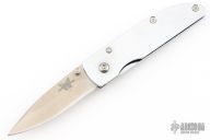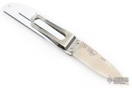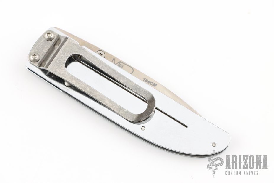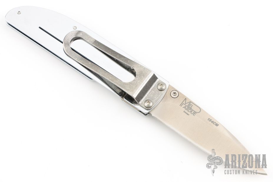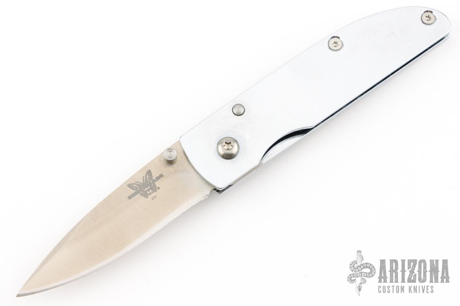Mel Pardue designed money clip knife by Benchmade. Satin finished drop point blade with single thumbstud. Stonewash/polish finished handle with tip up clip. Includes original box and paperwork. Has a couple light scuffs, excellent condition.