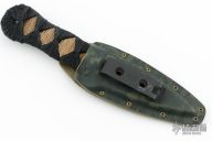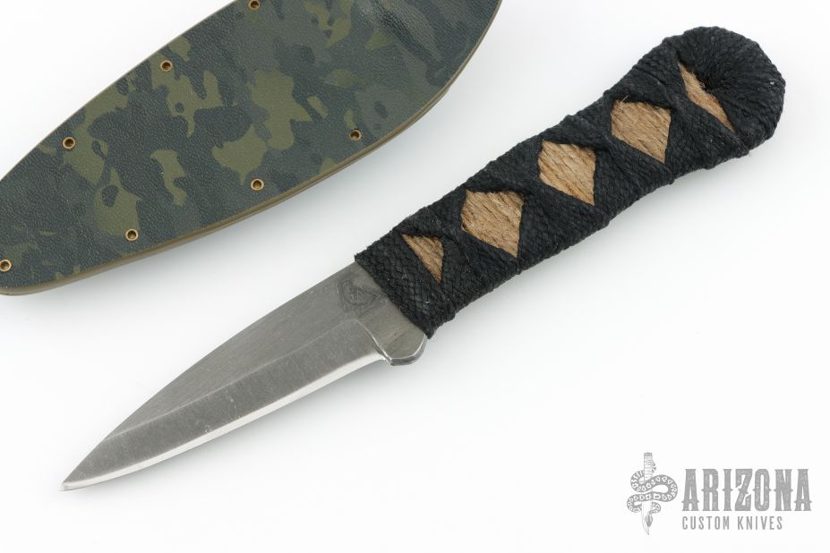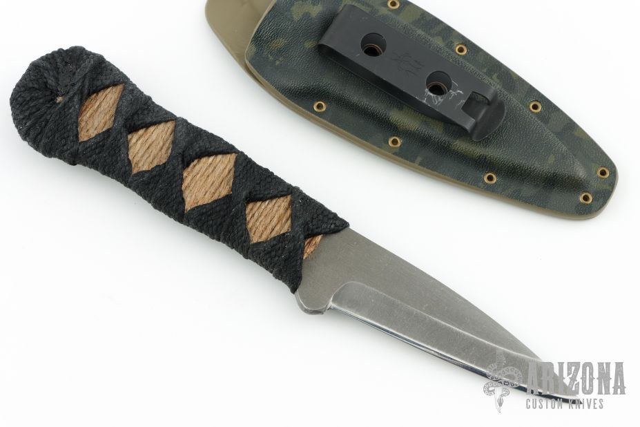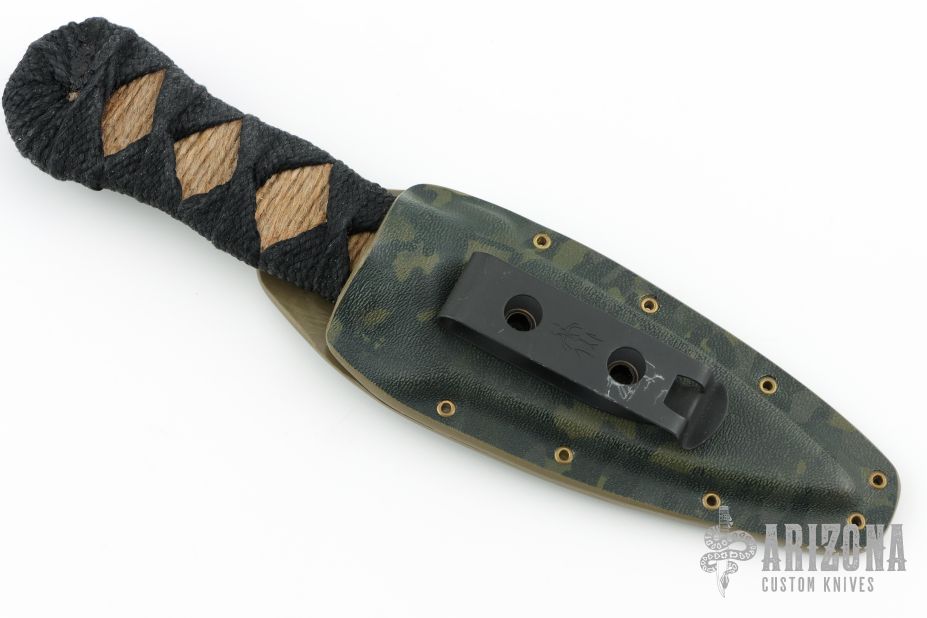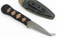 This Vargr by Offensive Industries features an acid tumble finished blade with .129" blade stock and .959" blade depth, hidden tang construction with black and tan cord wrapped grip. Comes with an ambidextrous kydex sheath with clip. Excellent condition.
