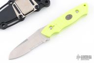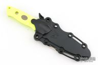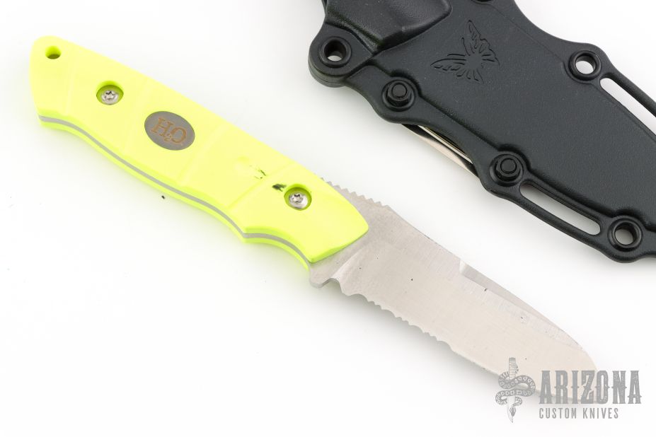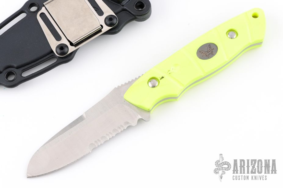 The Benchmade knife features a stonewashed sheepsfoot blade with partial serrations, a notched thumbrest and a full tang construction.  .112" Blade Stock.  1.10" Blade Depth.  The handle features yellow G-10 scales.  Includes a kydex sheath, the original box and papers.  Has some scuffs from the sheath. Excellent condition otherwise.