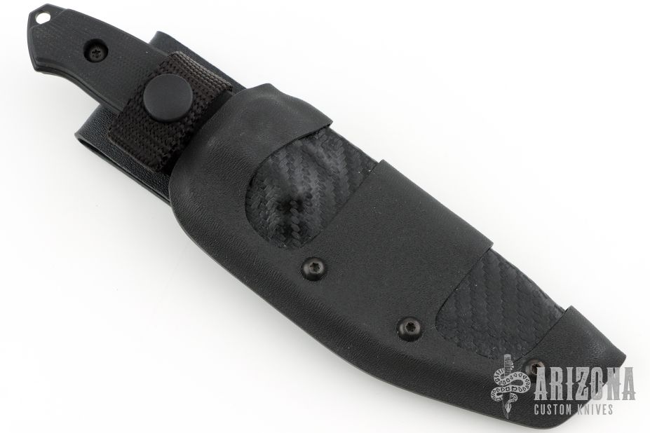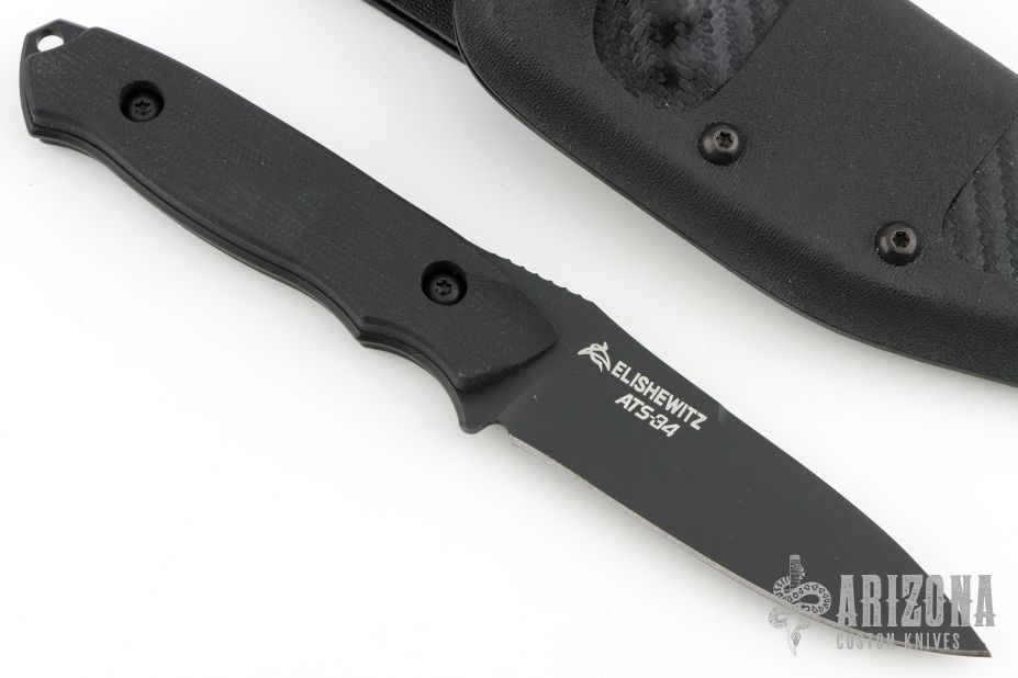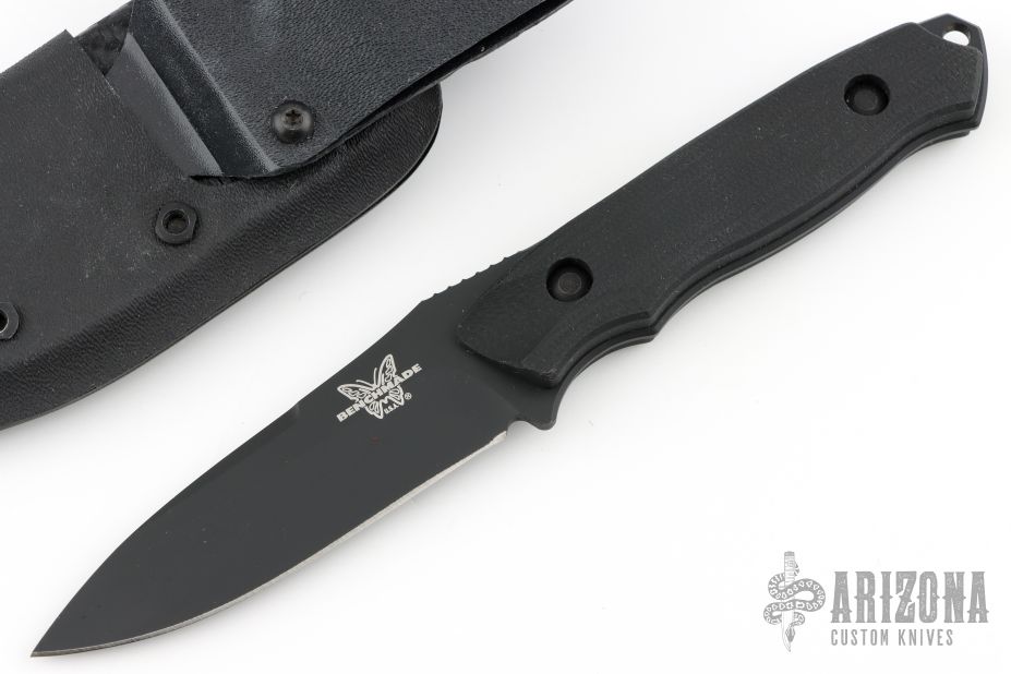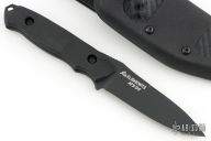 This Nimravus Cub by Benchmade has a black blade with notched thumbrest, .117" blade stock and 1.137" blade depth, full tang construction. The handle has black G-10 scales with lanyard hole at the butt. Comes with wrong Benchmade box(Listing is 145BT box is 145HS), papers and kydex sheath. Has a few light sheath scratches, otherwise excellent condition.