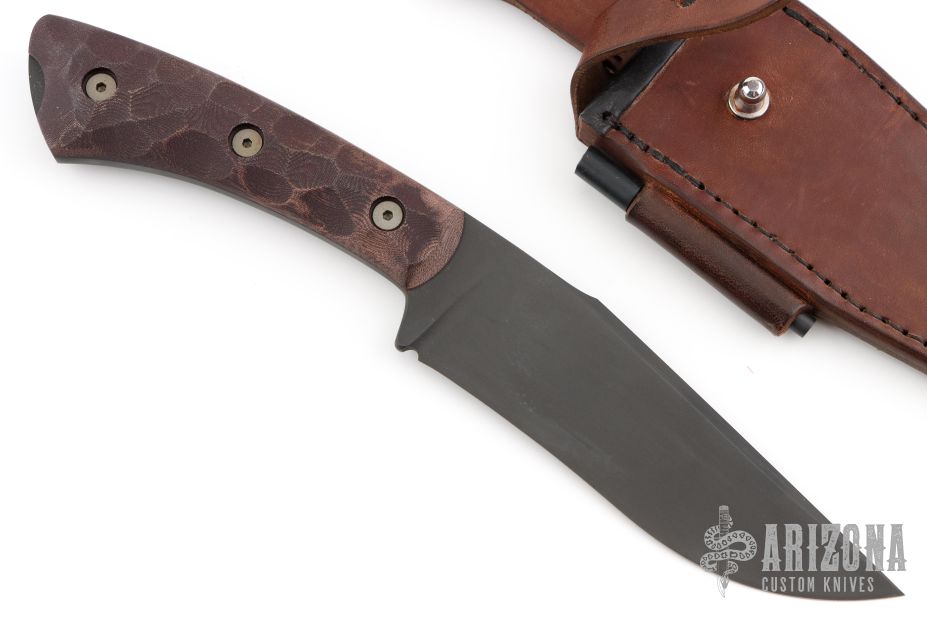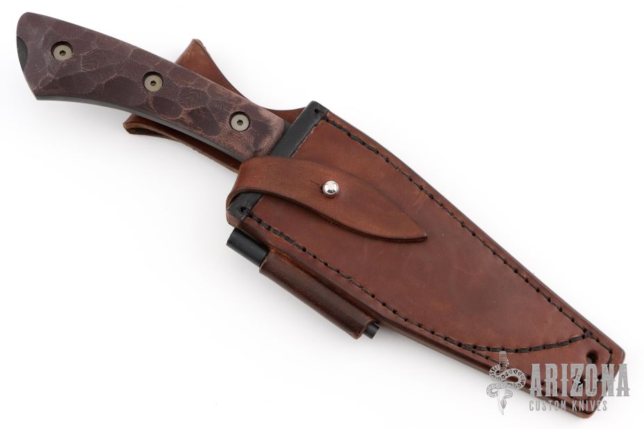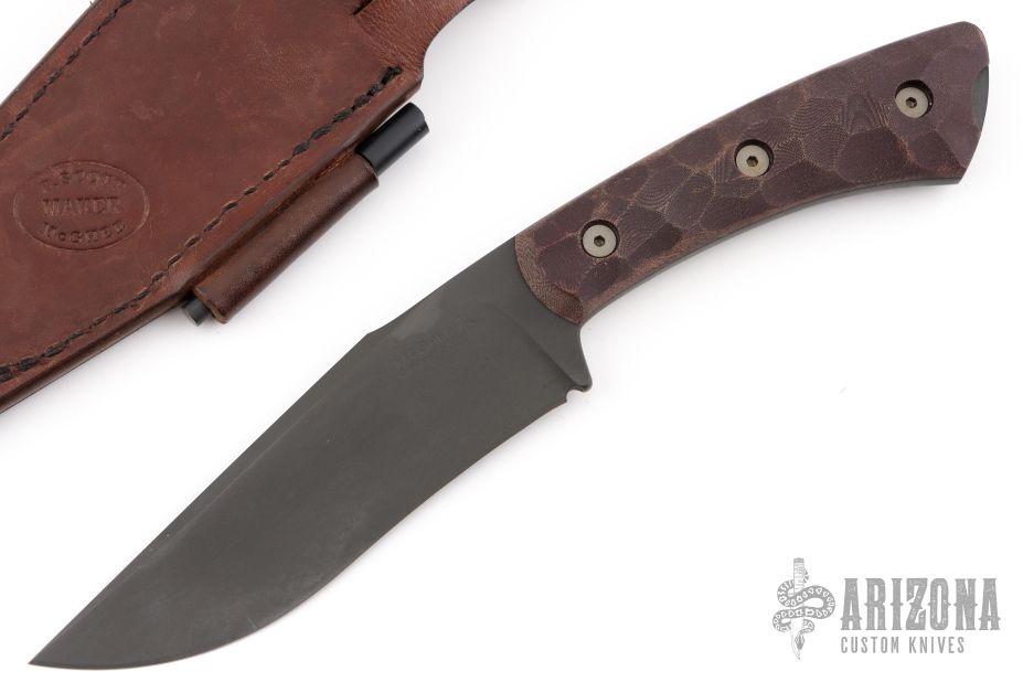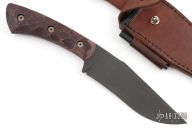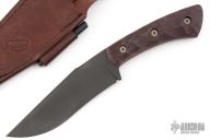 This Rover Elite by E. Scott McGhee of Guinea Hog Forge features a clip point recurve black blade with false top edge, .189" blade stock and 1.621" blade depth, full tang construction. The handle has contoured maroon linen micarta scales. Includes a brown leather sheath with fire steel. Excellent condition.