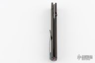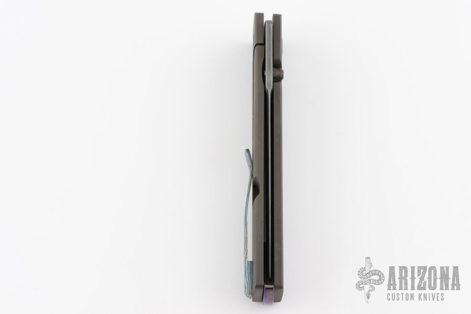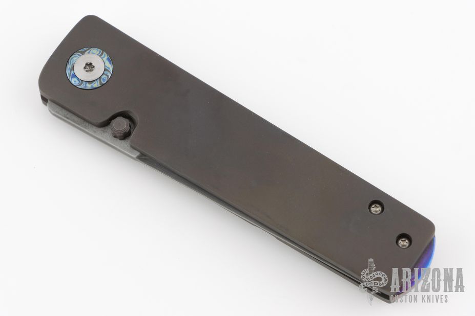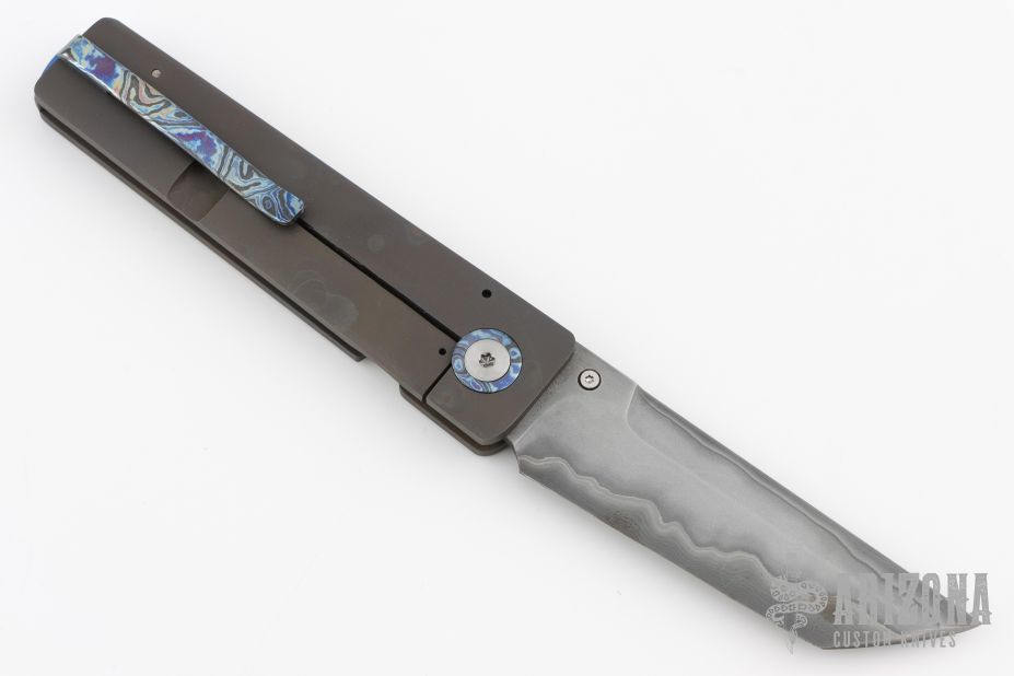 This Gent XL Framelock by Old Dominion Knifeworks features a Double Clad San Mai Damascus blade with Damascus core, dual thumbstuds. The handle has a bead blasted and dirty anodized titanium frame with a black timascus backspacer, pivot collars and tip up clip with hidden screws. Rides on bearings, Nice detent, lockup and blade seating. Comes with a zippered case and COA dated "May 2020". Has some light oxidation on the blade, otherwise excellent condition.