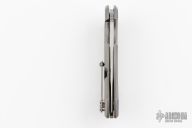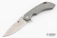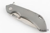 This Wayfarer 247 from Olamic Cutlery features a satin finished blade with swedge, thumbhole, notched thumb rest and flipper. The titanium handle scales are matte finished titanium with a matching pocket clip is positioned for tip up carry with a ceramic ball inlay, floating titanium backspacer. The Wayfarer 247 is very comfortable in the hand and flips well with no wrist action needed. Blade is centered when closed and locks up with no play. T525 on the backspacer. Excellent condition. Comes with zippered case and COA dated 11-15-16.