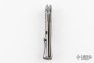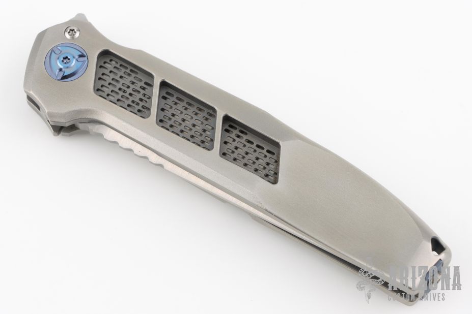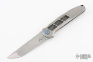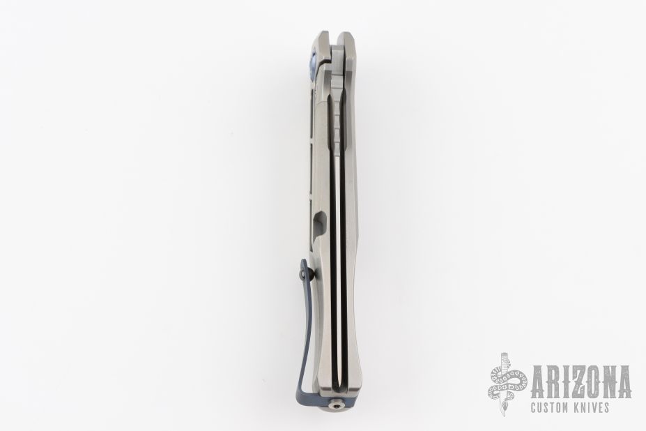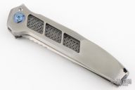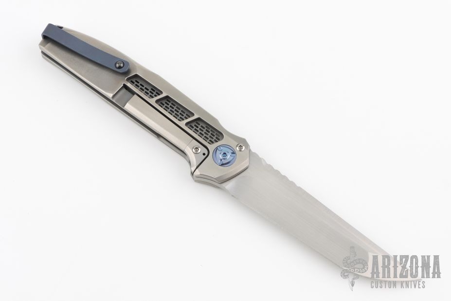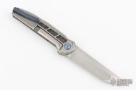This XV flipper by Reate is a Liong Mah design, it features a hand rub satin finished blade with a notched thumbrest and flipper. The handle has an orange peel finished titanium integral frame, tip up reversible titanium clip with ceramic ball, stainless lockface insert. Rides on bearings, nice detent, lockup and blade seating. Comes with a zippered case. Excellent condition.
