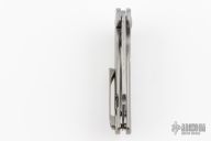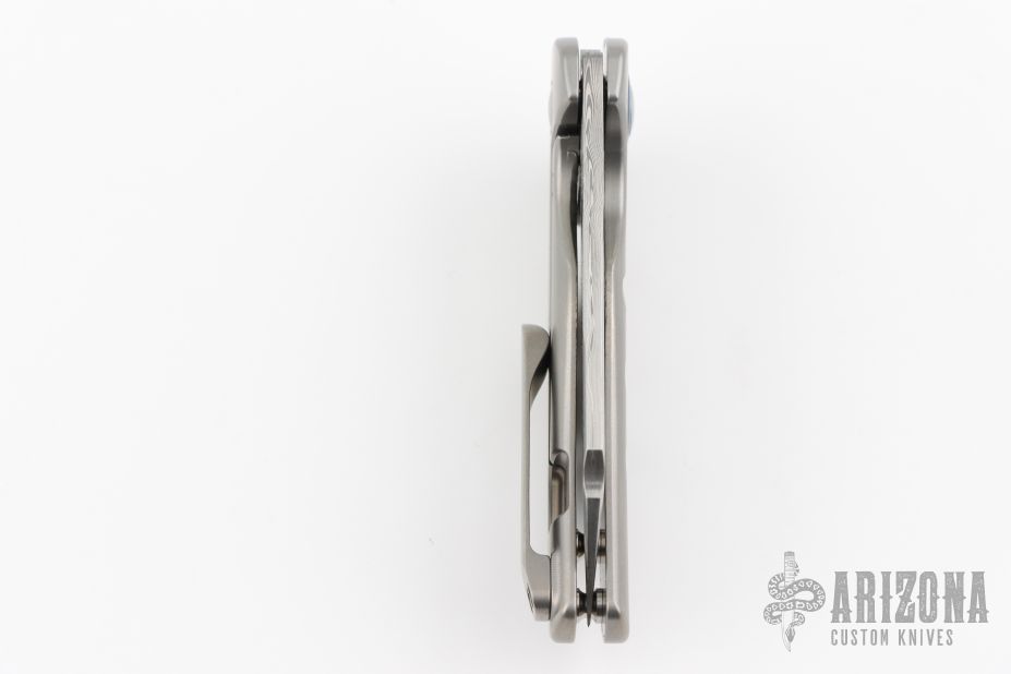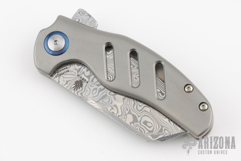 The Kizer C01C features a heavy-duty cleaver design from Chris Conaway of Sheepdog Knives. Its large sheepsfoot style blade is made from Damasteel. The blade deploys effortlessly on a smooth ball bearing pivot, and locks up solid. Contoured titanium handle scales provide a comfortable grip and a resilient build. This knife offers a remarkable combination of tactical functionality and a refined, stylish appearance.