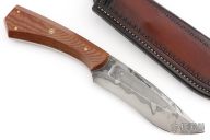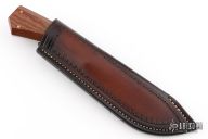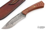 This knife by Matt Bailey features a hand forged blade with hand rub satin grinds with a hamon and forge finished flats, .193" blade stock and 1.436" blade depth, full tapered tang construction. The handle has brown linen micarta scales. Comes with a tooled brown leather sheath. Excellent condition.