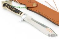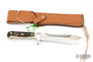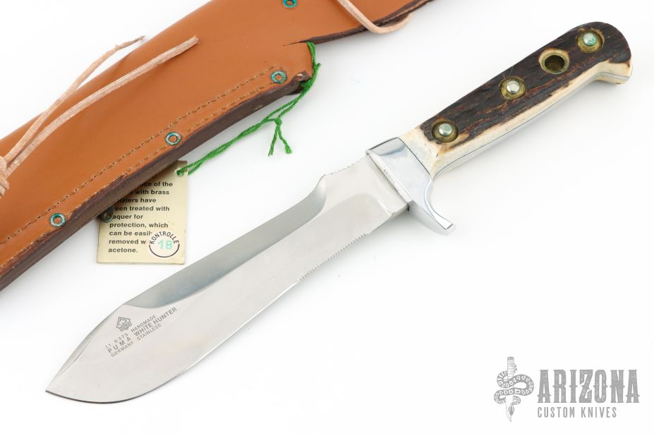 This White Hunter by Puma is the ultimate outdoorsman’s knife, originally designed by African professional hunters. It features a curved blade for cutting, slicing and skinning and a strong back edge for hacking. Handmade by skilled craftsmen with stag scales. #26182 on guard. Made in 1989. Comes with original brown leather sheath, box and papers. Has a couple light scuffs and scratches, excellent condition otherwise.