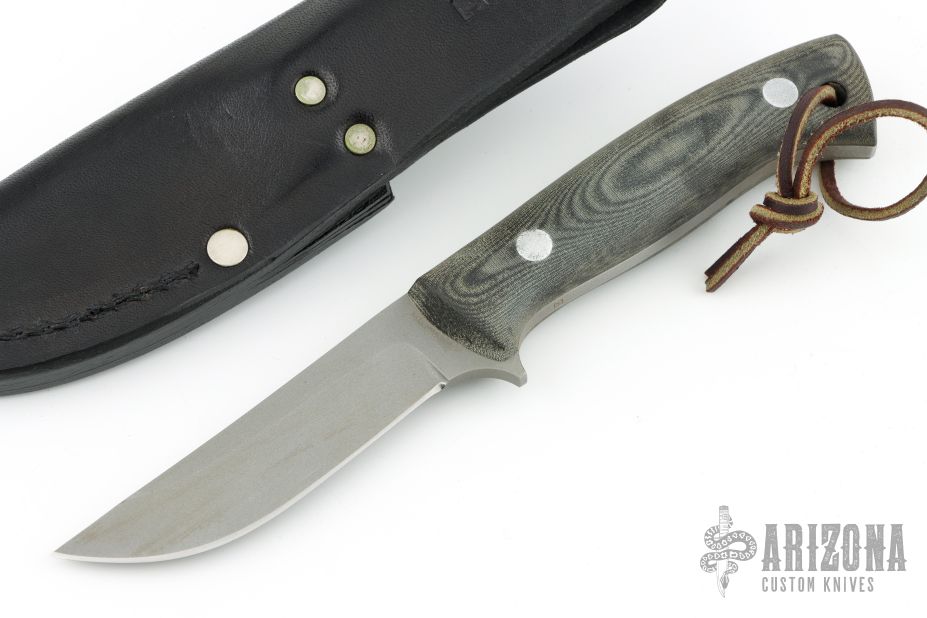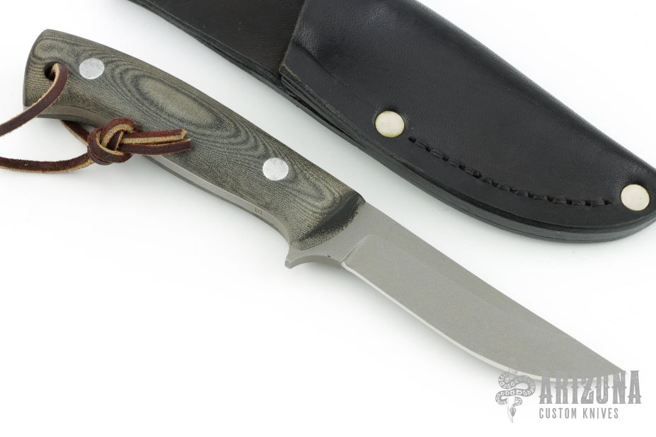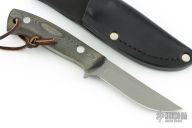 This knife features a bead blast finish blade with .176" blade stock and .895" blade depth, full tang construction with green linen micarta scales. Comes with a leather/kydex sheath. Marked with an "E" on the belly of the knife handle. Sheath is also marked "E". Please notify us if you know who made this knife. Has scratches, and oxidation. Fair condition.
