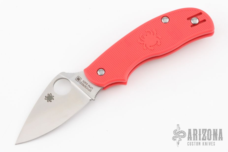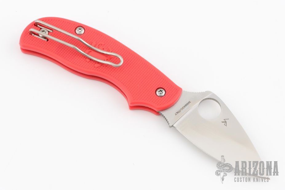 This Urban knife by Spyderco features a satin finished blade with thumbhole and notched thumbrest. The handle has red FRN scales with a reversible tip up clip. New condition. Comes with original box and papers.