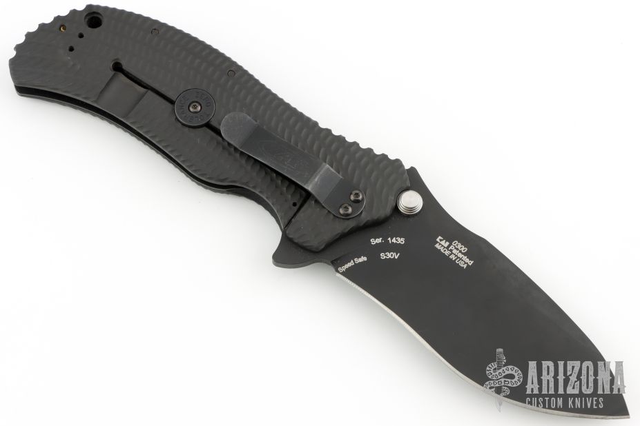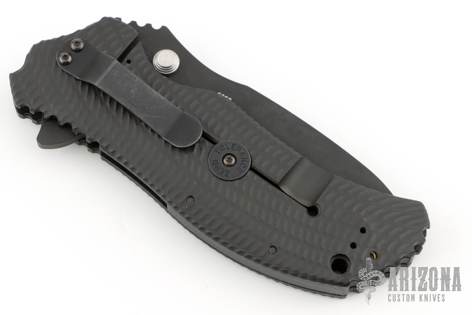 This knife is a Ken Onion design executed by Zero Tolerance and features a recurved spear-point blade with a black finish, stainless steel liners and black G10 scales. It also features the Speed-safe assisted opening system. The black coated steel clip is 4 way adjustable. Includes the original box. S/N 1435.  Comes with original box and papers. Has some scuffs and scratches, great condition otherwise.