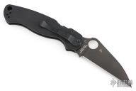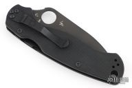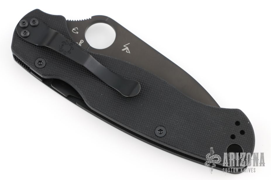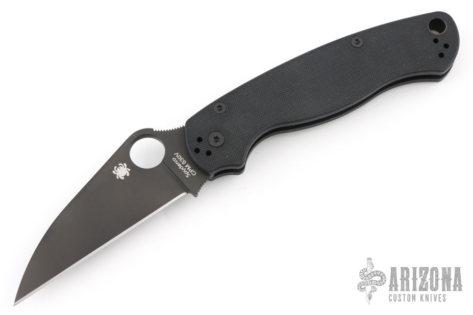 This Paramilitary 2 Liner lock Folder from Spyderco has a black wharncliffe blade with thumbhole and notched thumbrest. Handle has black G-10 scales, nested stainless steel liners and stainless steel tip up clip. Comes with original box and papers. New condition.