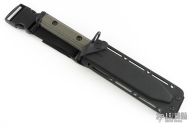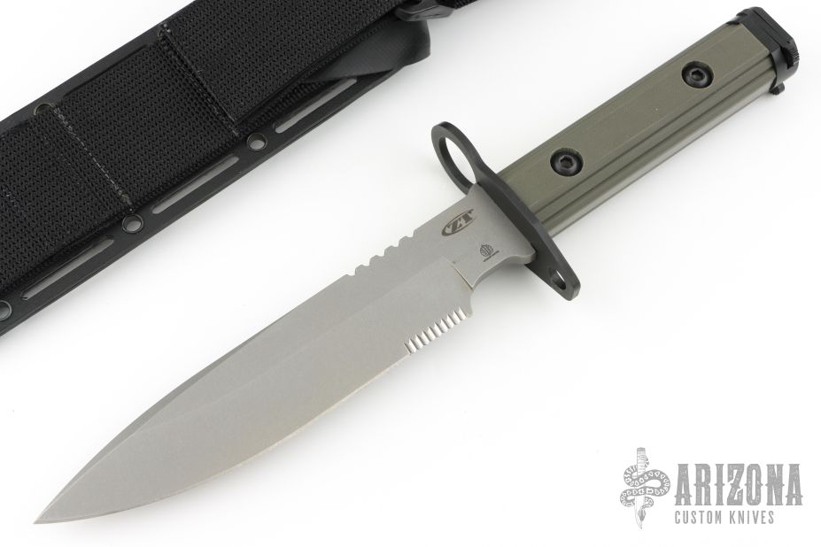 This ZT-9 Bayonet by Zero Tolerance is a Mick Strider design. It features a tumble finished drop point blade with swedge, notched thumbrest and partial serrations. The handle has a black oxide coated stainless steel guard with muzzle hole and machined OD G10 scales over full tang construction. Bayonet lug clasp on pommel. Comes with original box, papers, and sheath. Has some scuffs, excellent condition otherwise. .25" Bladestock, 1.468" Blade depth, and Serial #0314.