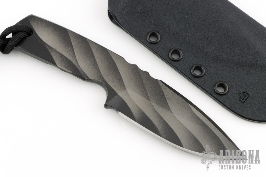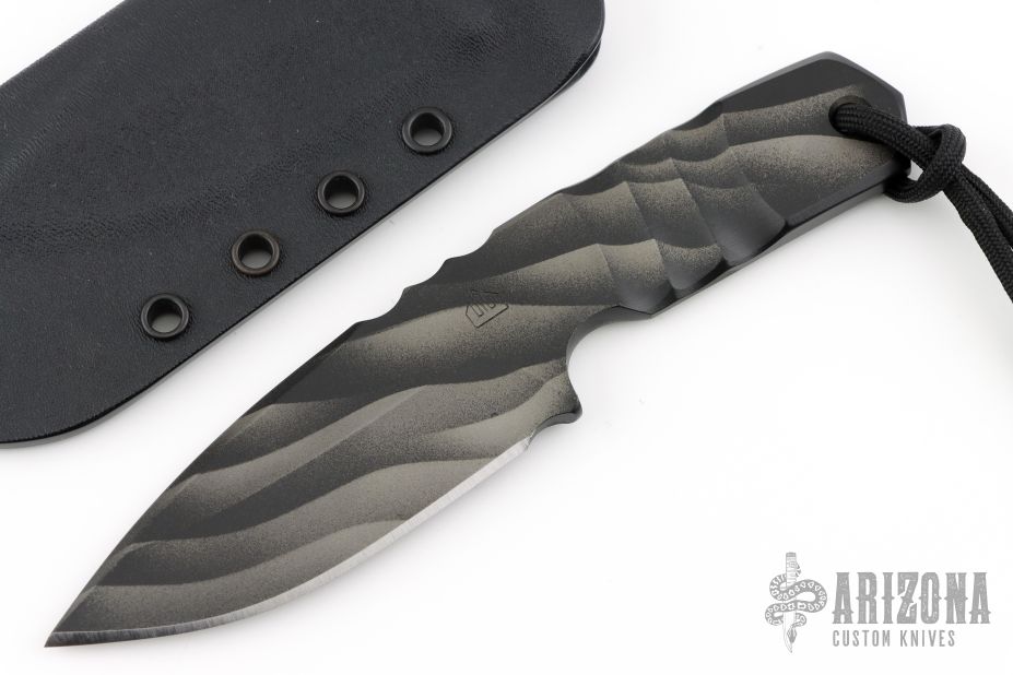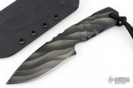This knife from Crusader Forge features a drop point blade with false top edge, notched thumb rest, full tang construction with blade thickness of .251" and depth of 1.455".  The handle is sculpted with a lanyard hole in pommel. 3D Cerakote. The handle is only sculpted on one side, like a chisel grind. Comes with original box, and Kydex sheath. Has a couple light scuffs, otherwise excellent condition.