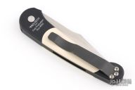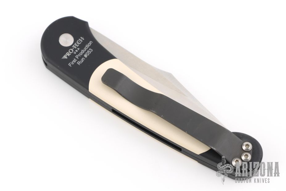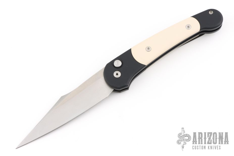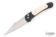This Monaco by Pro-Tech is a nice sleek automatic with a satin finished clip point blade. The handle is black aluminum with an ivory micarta scales. First production run, serial number #053. Has a couple light scuffs and scratches, excellent condition otherwise.