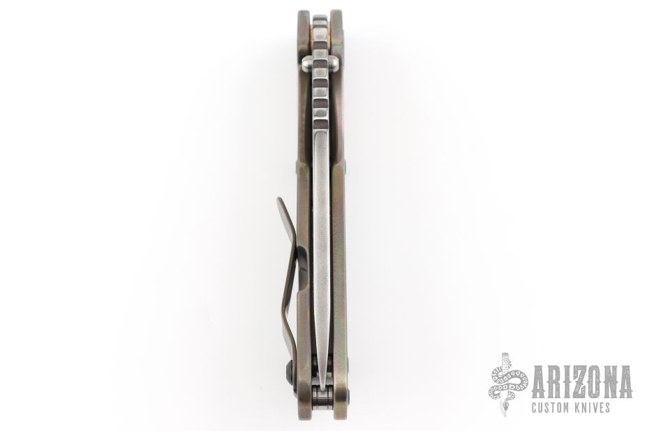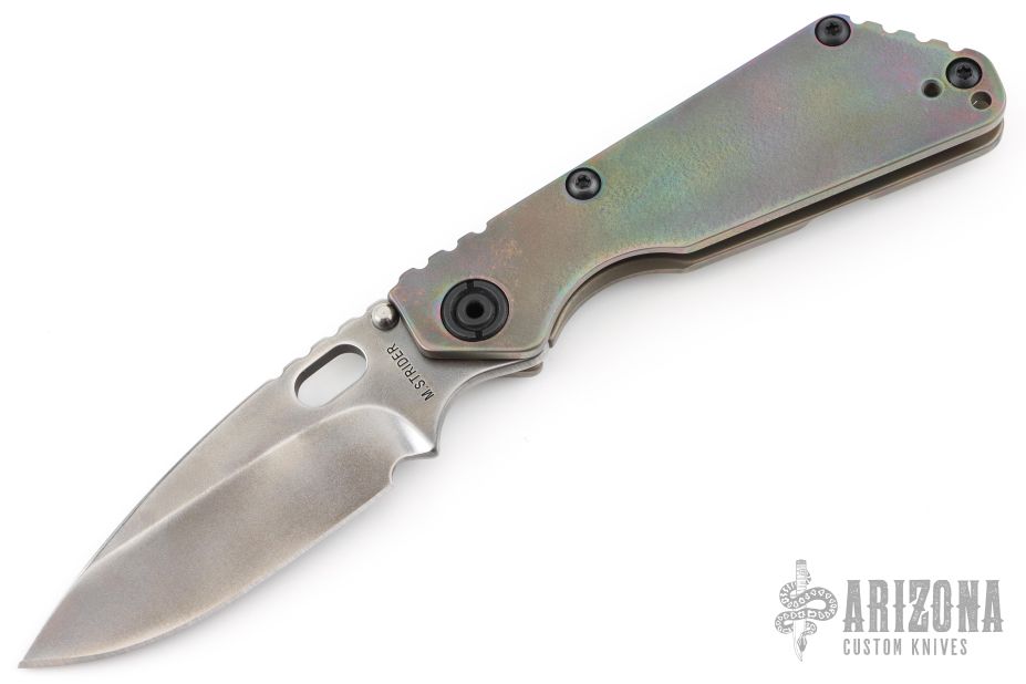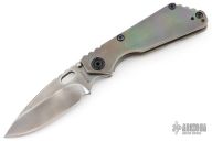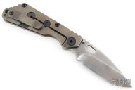 This Mick Strider SNG framelock folder features a smoke finished drop point blade with thumbhole and notched thumbrest. The handle has a titanium frame with titanium clip, tip up carry. Jimping on blade spine. Includes Hinderer "Lock Bar Stabilizer" for maximum reverse lock retention. Nice lockup, detent, and blade seating. Excellent condition.