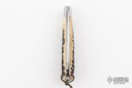 This Flush Joint by Tom Ploppert features a hand rub satin finished blade with a single nail nick.  The handle has stainless steel bolsters with integral liners, stag covers with dog's head escutcheon, stainless steel springs. Lanyard tube and leather lanyard with beads in pommel.  Has half stops, flush in all positions. Includes a padded zippered case. Excellent Condition.