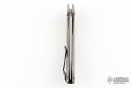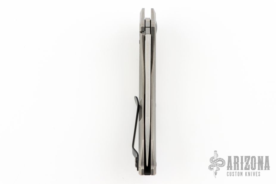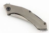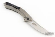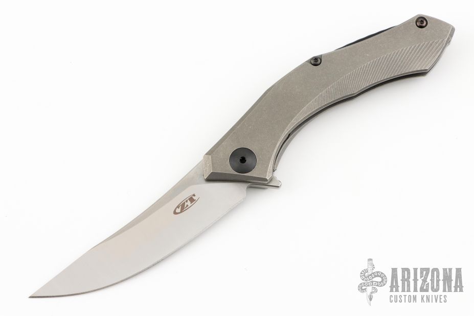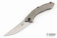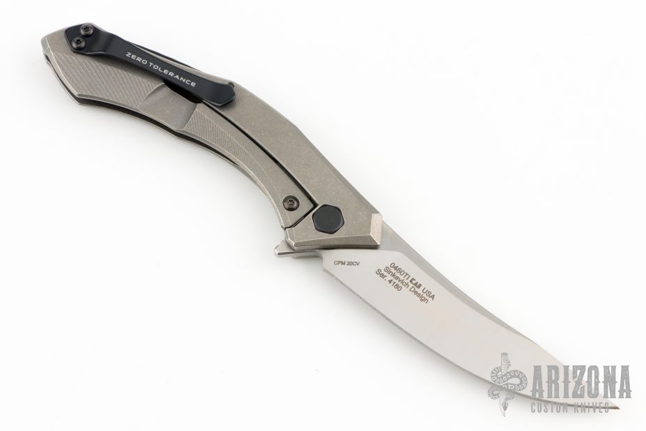 This 0460 Sinkevich Design flipper by Zero Tolerance features a satin finished upswept blade with flipper and swedge. The handle has a titanium frame, black aluminum backspacer and a tip up reversible titanium clip. Nice detent, lockup and blade seating, rides on bearings. Has stainless steel lockface insert and overtravel stop, ceramic detent ball. S/N 4180. Comes with original box and papers. Has a couple light scuffs, excellent condition otherwise.