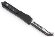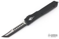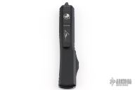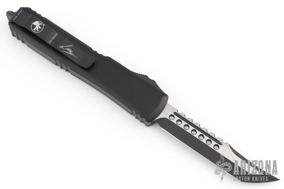 This Ultratech Hellhound by Microtech Knives features a two-tone black DLC blade with notched thumbrest and fullers, false top edge. The handle has a black aluminum frame with tip down black stainless steel clip, black DLC hardware, black titanium thumbslide. Comes with original box and papers. Excellent condition. Dated 03/2023 and s/n 2445.