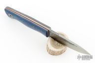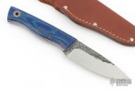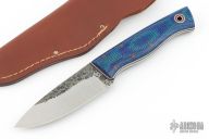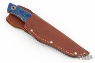 This Bushfinger features a two tone blade with spalted flats and satin grinds, .152" blade with 1.303" blade depth, full tapered tang construction. The handle has blue/green burlatex scales, white G-10 and micarta liners. Comes with a brown leather sheath and original box. Excellent condition.