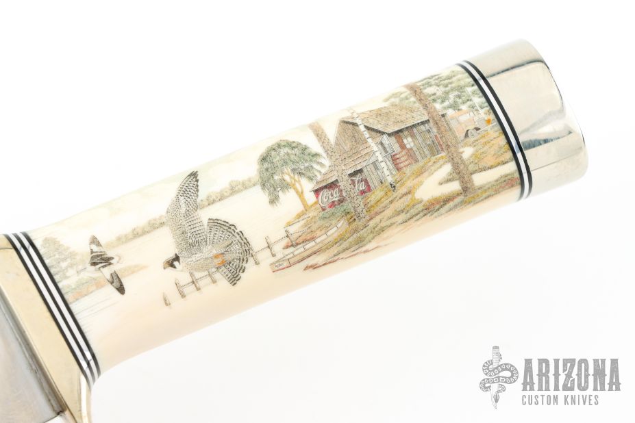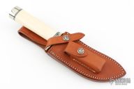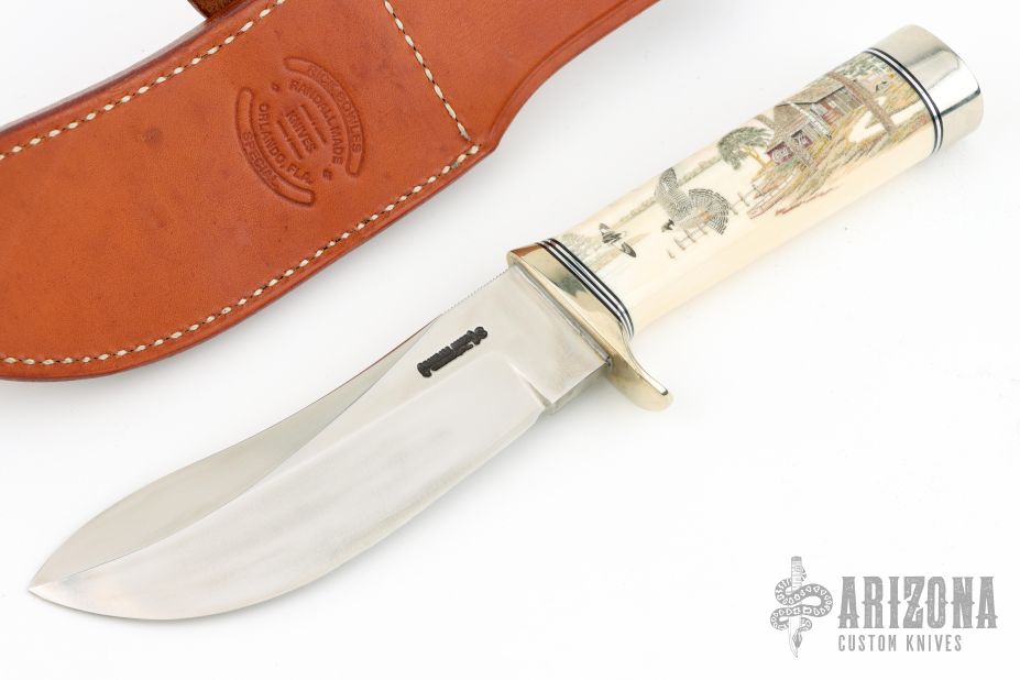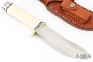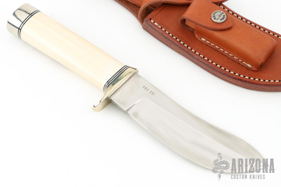 This Rick Bowles Special by Randall has a satin finished stainless steel blade with false top edge and notched thumbrest, .244" blade stock and 1.561" blade depth, hidden tang construction. The knife carries the small Randall logo stamp and the backside is etched with "RBS 251". The handle has a nickel silver guard and butt, walrus ivory grip with black and duralumin spacers. The grip has been scrimshaw by Rick Bowles and is #940. Comes with a brown leather sheath and a Randall zippered case. Excellent condition.