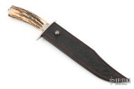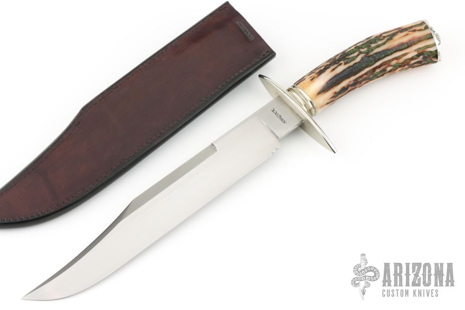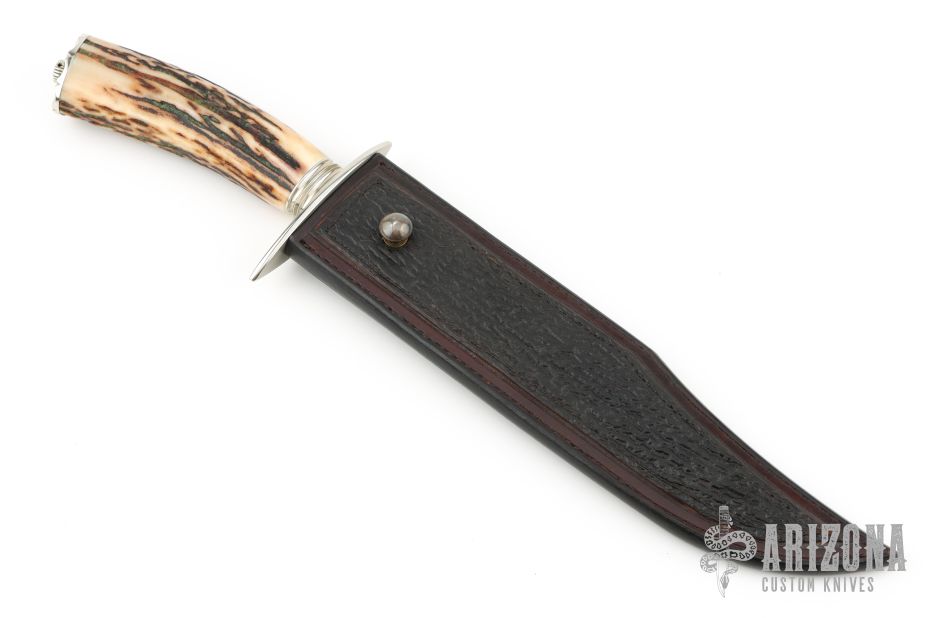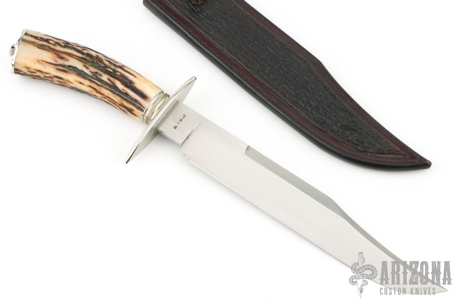 This Bowie by Master Smith Tim Hancock features a hand rub satin finished blade with false top edge, .235" blade stock and 1.354" blade depth, hidden tang construction. The handle has a nickel silver guard and fluted collar, sambar stag grip, fileworked nickel silver butt with finial. Marked "19 MS 98" on back of ricasso. Comes with a black leather sheath with shark skin overlay. Comes with a zippered case. Excellent condition. Comes with COA and original sales receipt dated 6-15-98.