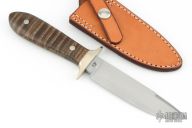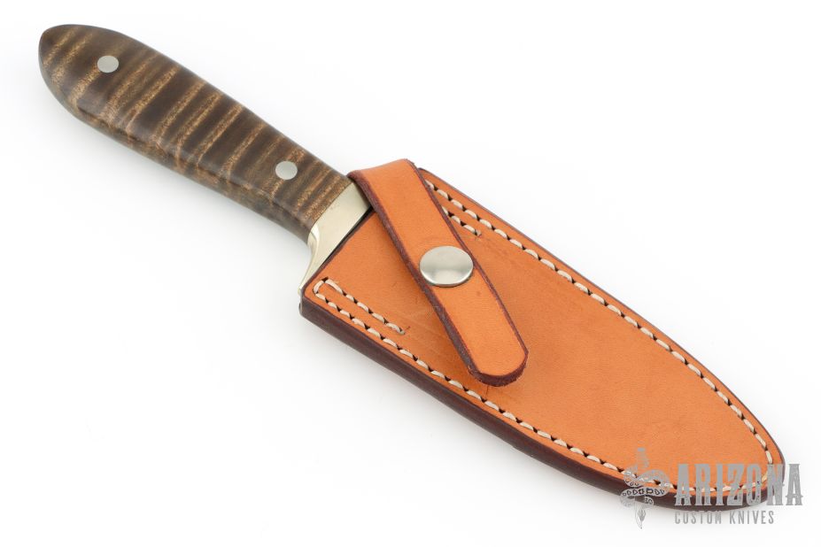 This Honcho from Master Smith Jerry Fisk has a hand rub satin finished blade with a sharpened top edge and nice hamon, .201" blade stock and 1.098" blade depth, hidden/mortise tang construction. The handle has a nickel silver guard and a tiger stripe maple wood grip with stainless steel pins. Includes a brown leather sheath by Kenny Rowe, and a zippered case. Has a couple of small oxidation spots near the tip, otherwise excellent condition. #1 of 5 that were made.