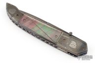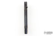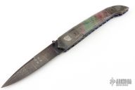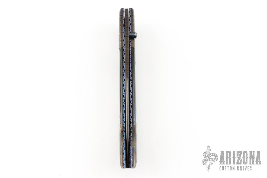 This linerlock by Master Smith Steve Schwarzer features a Mosaic Damascus blade with a single thumbstud with black lip pearl inlay. The blade is made of 5 different patterned bars running vertically. The handle has Mosaic Damascus bolsters, fluted black lip pearl scales, fileworked and anodized titanium liners, fileworked and blued steel backspacer. Nice lockup and blade seating. Excellent condition. Comes with a zippered case.