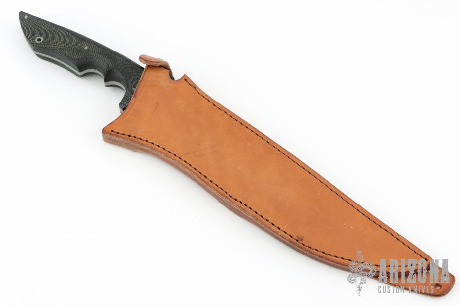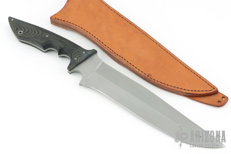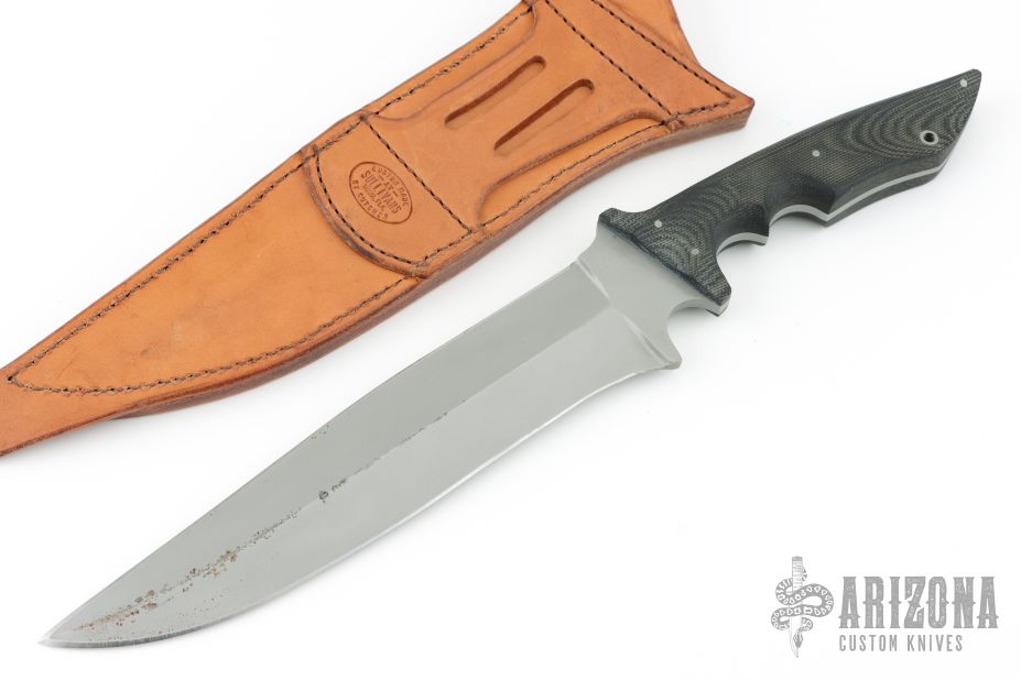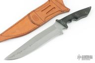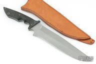 This Battle Bowie by the late Larry Harley features a bead blasted, double-edged blade with .245" blade stock and 2.019" blade depth, full tapered tang construction. The handle has nicely contoured black canvas micarta scales with a lanyard tube in pommel. Includes a brown leather sheath by Sullivans. Has some oxidation spots on the blade, has a few light scuffs, otherwise good condition.