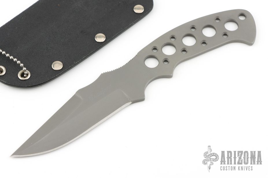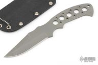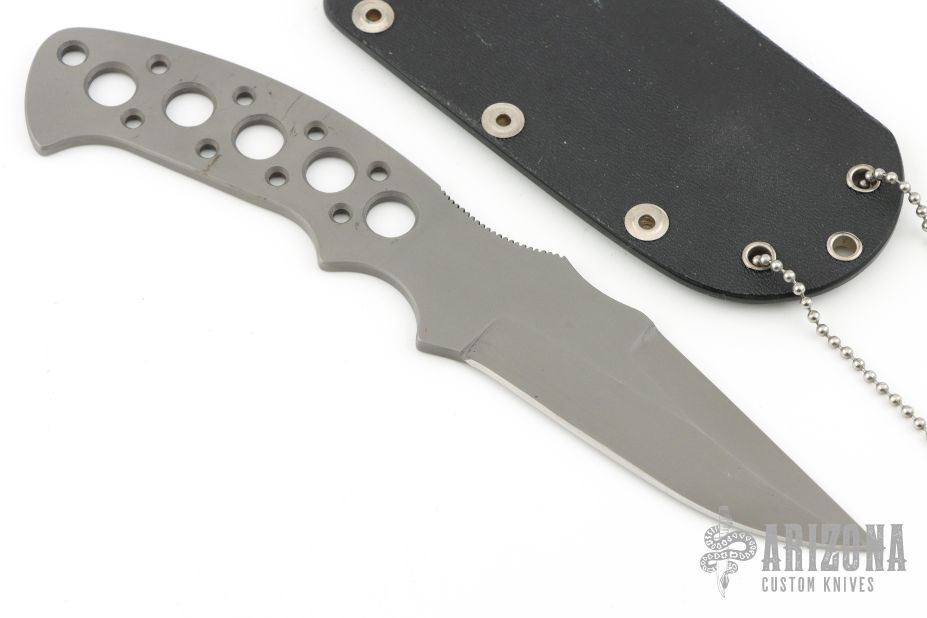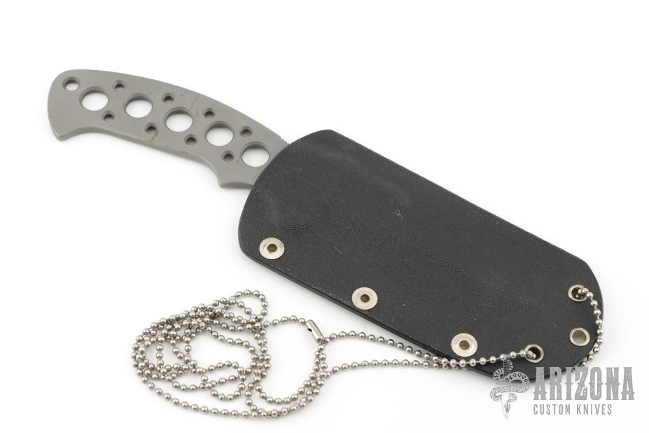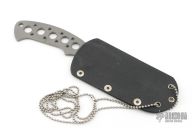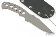 This Kasper Neck Knife from Pat and Wes Crawford features a bead blasted clip point blade with false top edge and notched thumbrest, .127" blade stock and 1.139" blade depth, full tang construction. Handle has been drilled to reduce weight for ease of carry. Comes with a Kydex sheath and ball chain. Has some light scuffs/scratches, otherwise excellent condition.