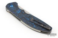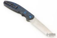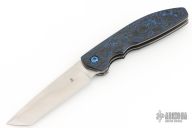 This Model 20 by Jason Clark features a satin finished tanto blade with false top edge and checkered flipper. The handle has blue TechnoCarbon scales, blasted titanium liners, black titanium tip up pocket clip and a floating stainless steel backspacer. Comes in maker leather pocket sheath. Has a couple light scuffs and scratches, great condition otherwise.