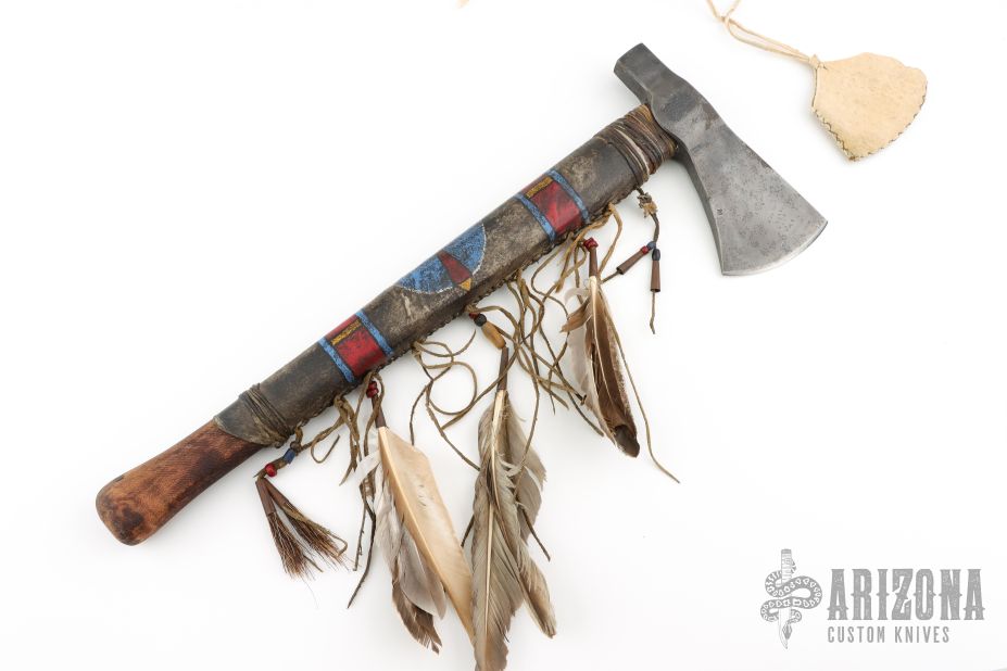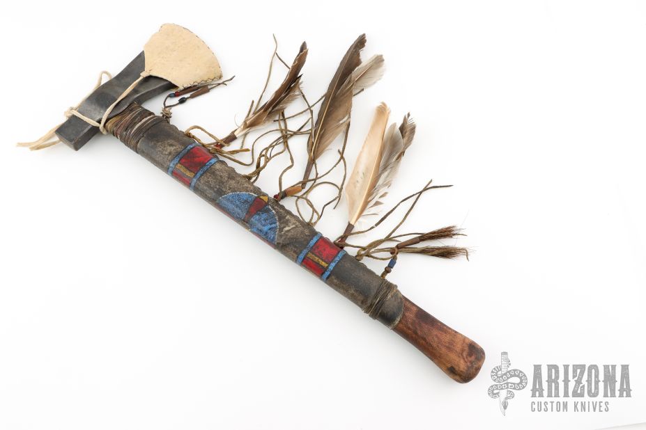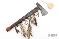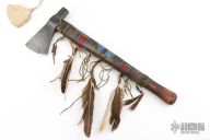 This Hammer Pole Tomahawk by Daniel Winkler features a hand forged axe head with hammer pole, 3" blade and 6.5" from edge to pole. The handle is maple with hand painted raw hide wrap with tassles and feathers. Comes with a leather blade cover. Comes with COA dated June 2000 and original sales receipt. Excellent condition.