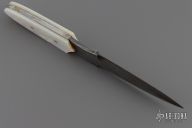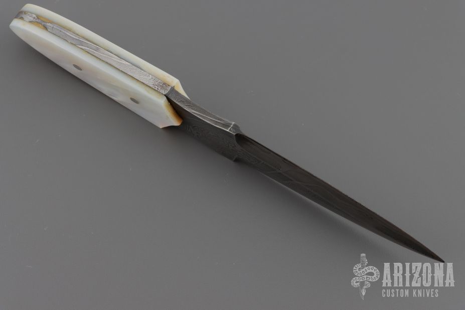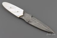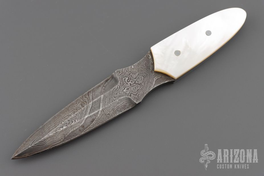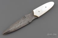 This Dagger features a double edged Damascus blade with .150" blade stock and .928" blade depth, full tang construction. The handle has mother of pearl scales. Has some light oxidation spots, otherwise good condition. Has "GM 97" scratched into the tang. Please let us know if you know who this is.