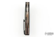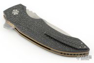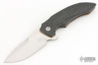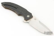 This M35 (Tashi Bharucha Design) was brilliantly executed by Andre Van Heerden. It features a hand rub satin finished spear point blade, with mirror polished flats, notched thumbrest and flipper. The handle has silver lightning strike carbon fiber scales, anodized titanium liners, carbon fiber backspacer, and a tip up silver lightning strike carbon fiber clip. Features IKBS. Nice detent, lockup and blade seating. Action is amazing. Has a couple light scuffs and scratches, excellent condition otherwise.