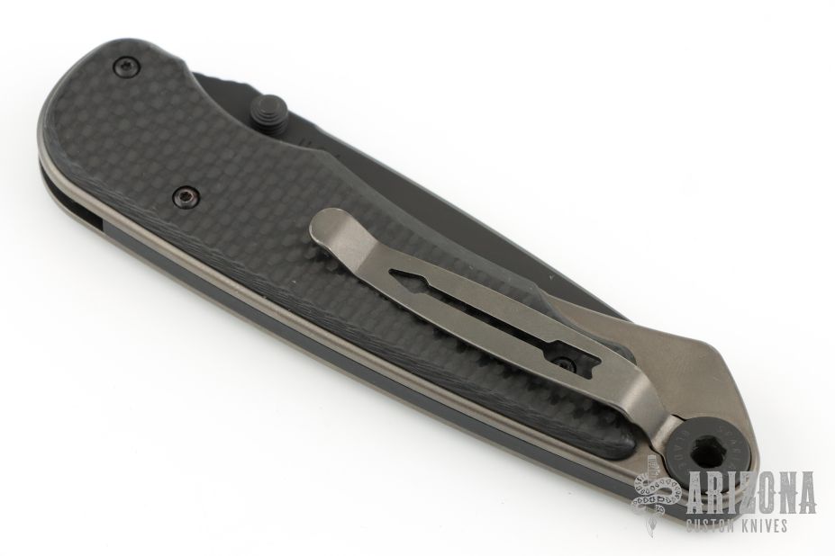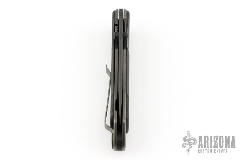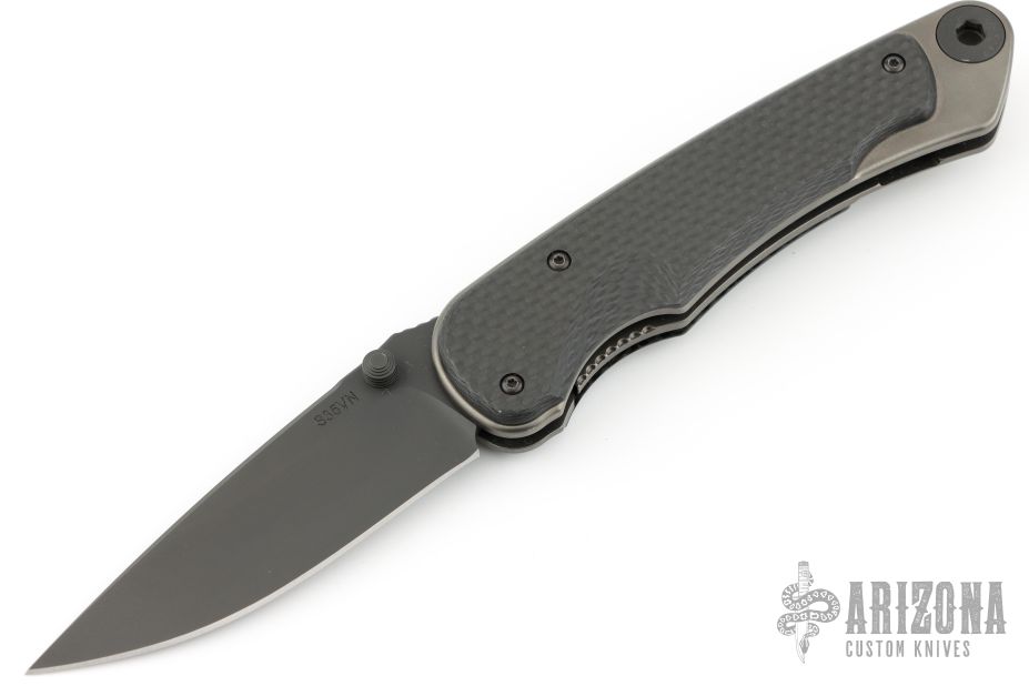 This Akribis linerlock folder by Spartan Blades features a Meteorite Gray PVD finished drop point S35VN blade with dual thumb studs and a notched thumb rest. The handle has carbon fiber scales, black PVD titanium liners, black G-10 backspacer and tip up black pvd titanium clip. Has nice detent, lockup, and blade seating. Has a couple light scuffs, excellent condition otherwise.