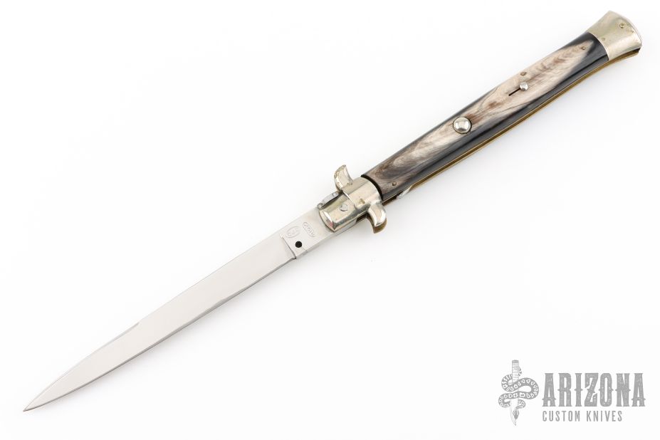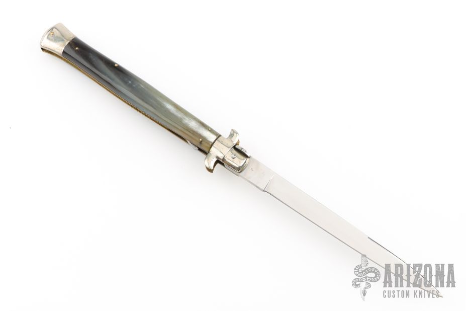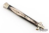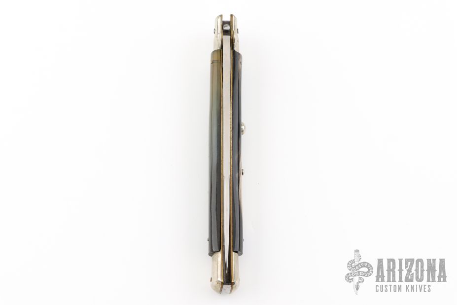 This 13" Swivel Bolster by D.J.D. features a bayonet ground mirror polished blade with false top edge. The handle has nickel silver bolsters, front and rear, buffalo horn scales, brass D-stamp liners, stainless spring. Has some light scratches and a little blade play, has been resharpened, has som light oxidation spots, otherwise good condition.