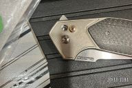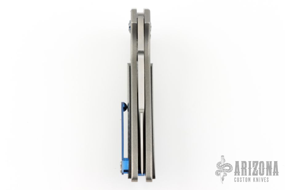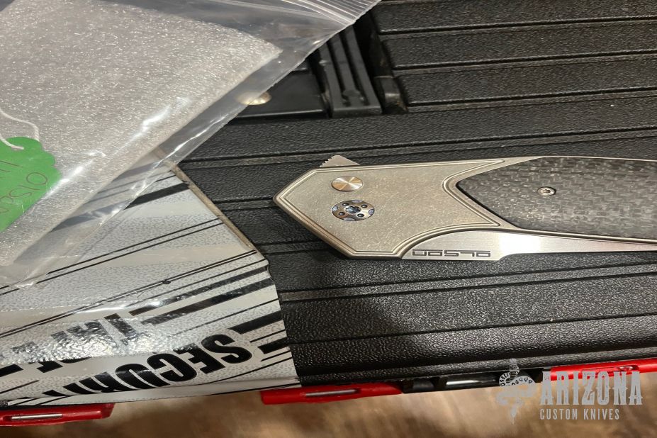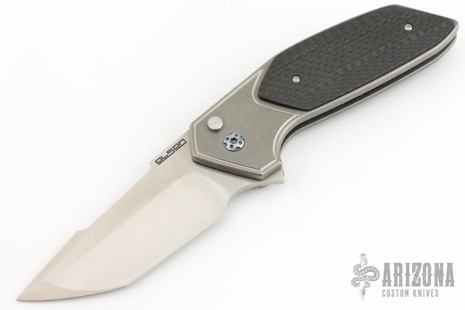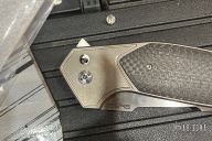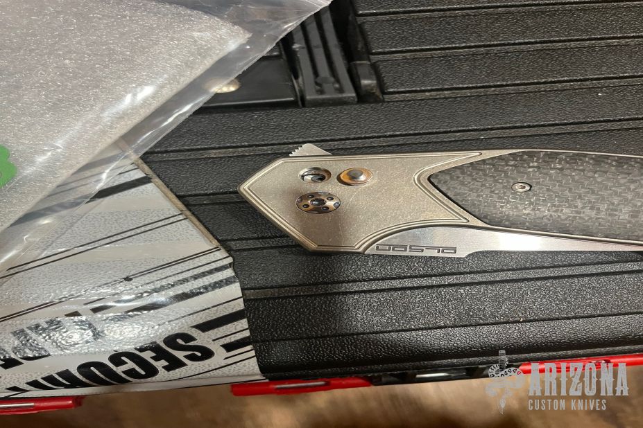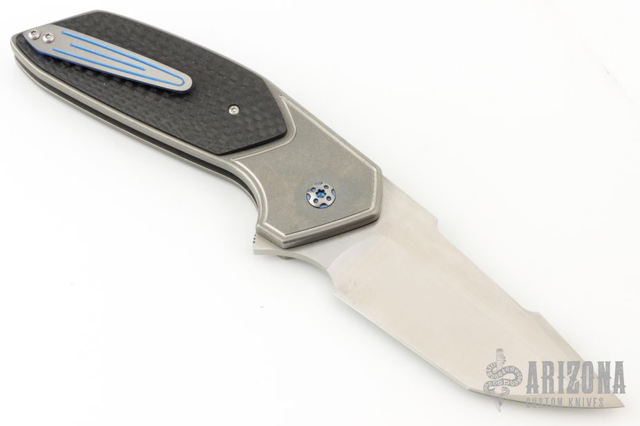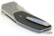 This JV Design Redemption by Rod Olson features a satin finished blade with notched flipper. The handle has a tumbled finished titanium frame with lightning strike carbon fiber inlays, anodized titanium backspacer with a titanium tip up clip. Has some light scuffs and scratches, excellent condition otherwise.  The push button has broken and needs to be replaced.