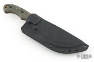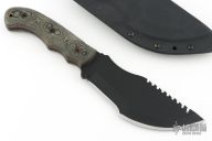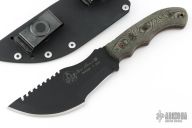 This Tom Brown Tracker by Tops features a black coated blade with sawteeth on the spine, .240" blade stock and 2.427" blade depth, full tang construction. The handle has black linen micarta scales with red liners. Comes with a kydex sheath with dual metal clips. Excellent condition.