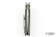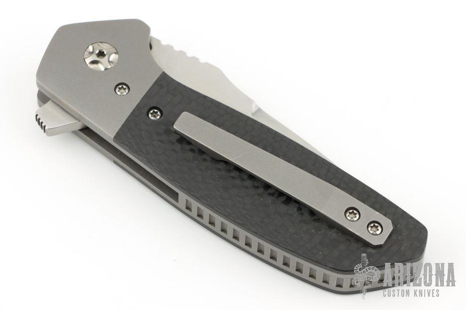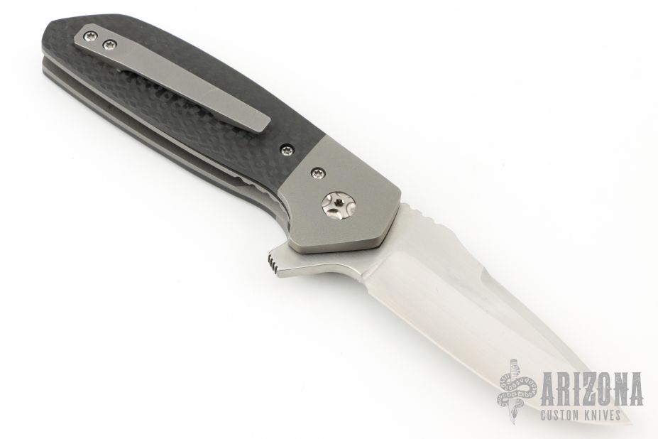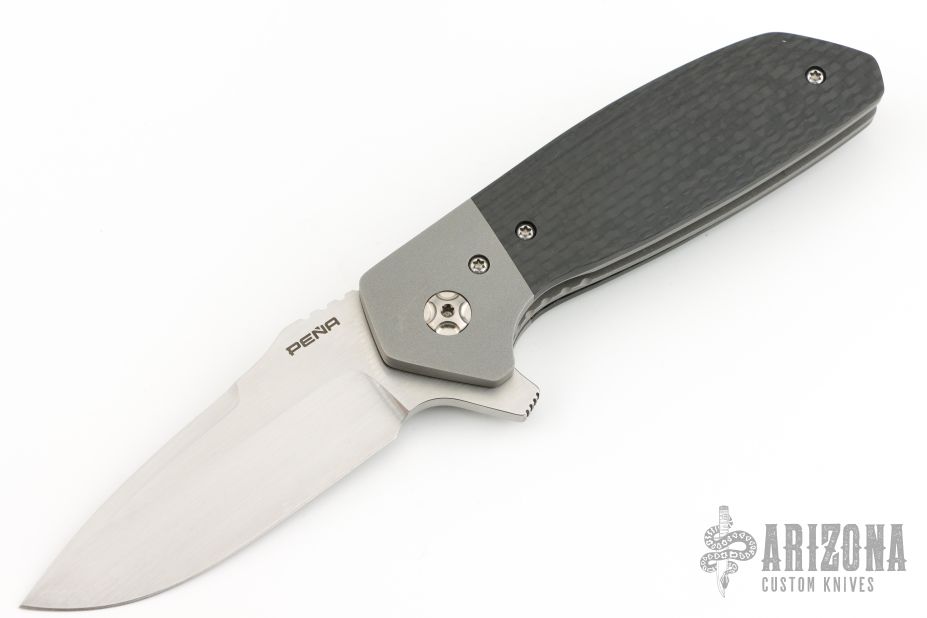 This Stinger flipper from Enrique Pena features a hand rub satin finished drop point blade with notched thumbrest and flipper and a false top edge. The handle has bead blasted titanium bolsters, carbon fiber scales with bead blasted titanium liners/backspacer/clip. Pocket clip is positioned for tip up carry. Very nice detent, lockup and blade seating. Comes with maker's zippered case. Has some light scuffs/scratches, otherwise great condition.