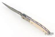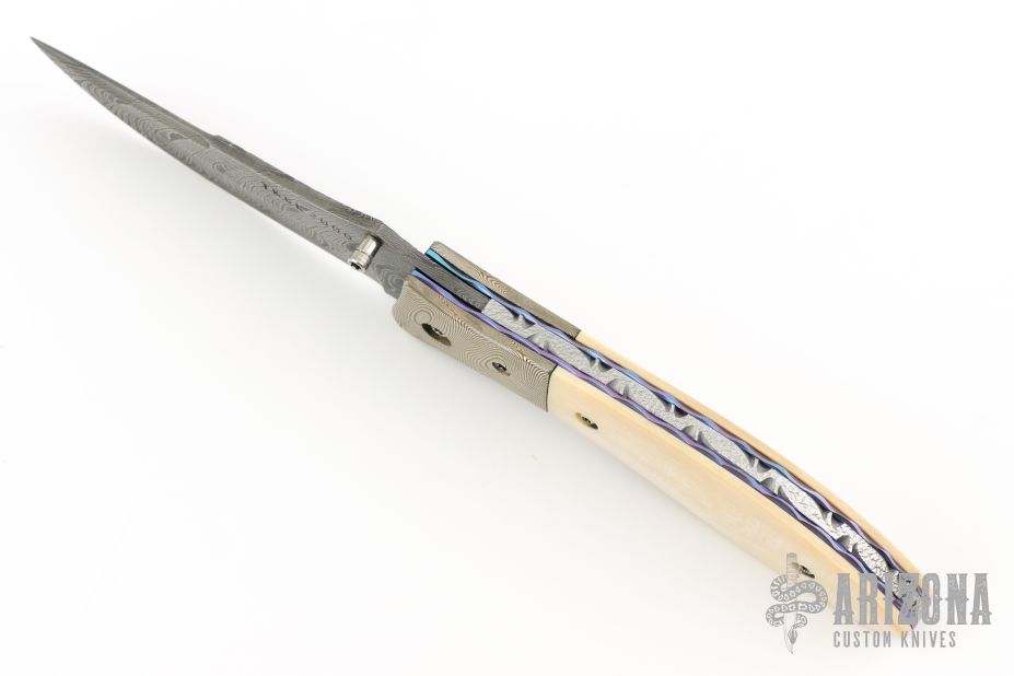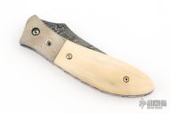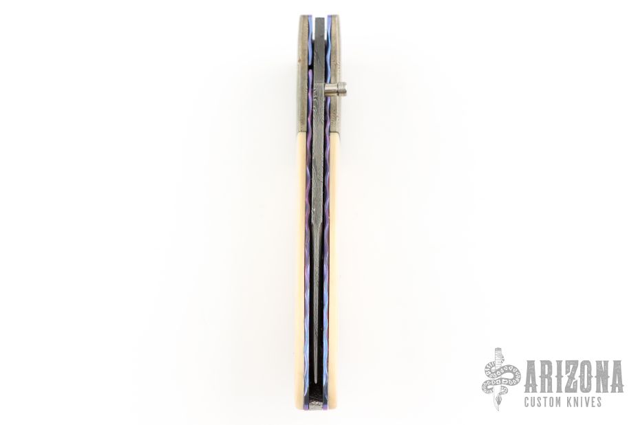 This Linerlock by Dale Reif features a Damascus blade with a single thumbstud. The handle has mokume bolsters, mammoth ivory scales, anodized and fileworked titanium liners, fileworked and textured stainless steel backspacer. Nice detent, lockup and blade seating. Excellent condition. Comes with a zippered case.