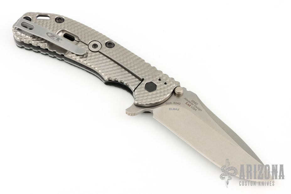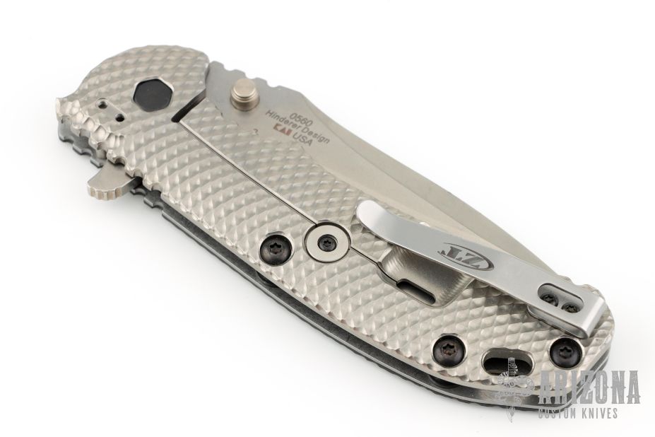 This ZT 0560 Hinderer design has a stonewashed drop point blade with dual thumb studs and notched thumb rest. Handle is black G-10 A-side with titanium B-side. Has 4-way reversible stainless steel clip and lanyard hole.  S/N 8242. Comes with original box and papers. Has some light scuffs and scratches, excellent condition otherwise.