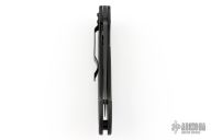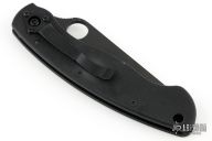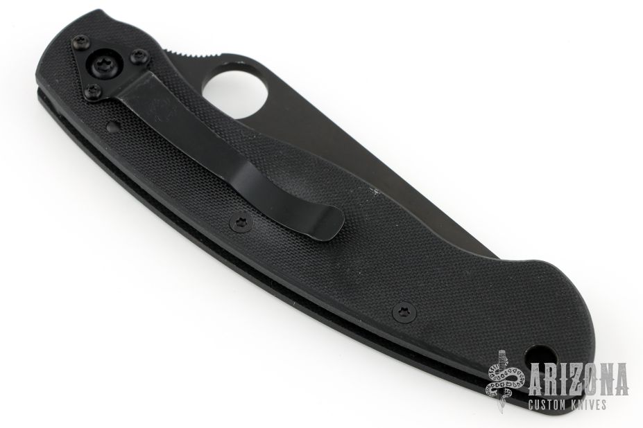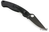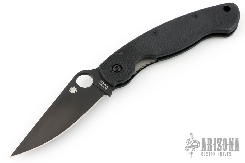 This Military Liner Lock by Spyderco has a black finished CPM S30V stainless steel clip point blade with notched thumb rest and thumb hole. Handle is black G10, with stainless steel single liner (lock), black fiber back spacer, black stainless steel tip down clip, and lanyard tube pin. Comes with original box. Has a couple light scuffs and scratches, great condition otherwise.