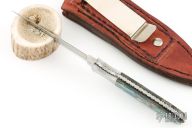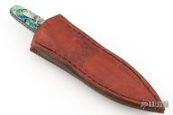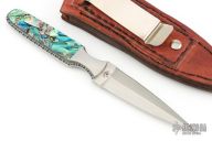 This Dagger by Bill Reddiex features a hand rub satin finished double edged blade with .136" blade stock and .830" blade depth, full tang construction. The handle has a stainless steel bolsters, abalone scales with a fileworked tang. Comes with a hand tooled brown leather sheath. Excellent condition.