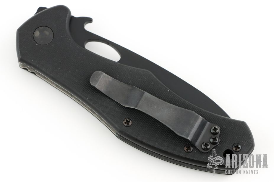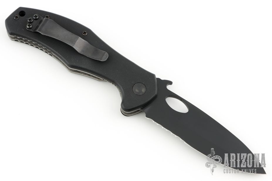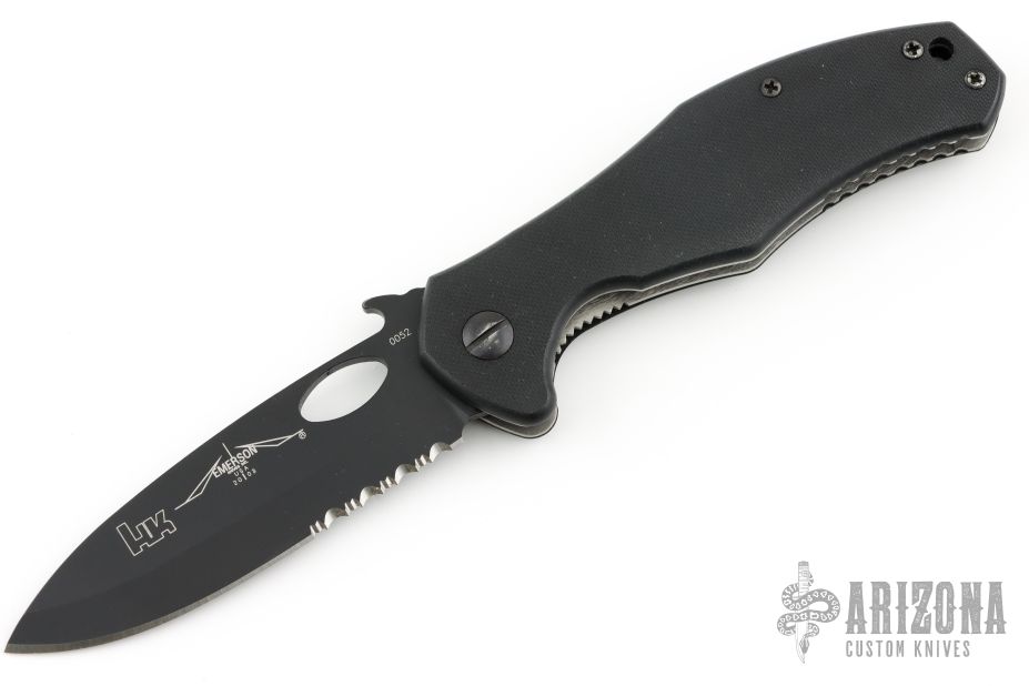 This CQC-10 is a production model produced for HK Firearms by Emerson Knives. The handle has textured black G-10 scales, titanium liners, black G-10 backspacer, tip up black stainless steel clip. Black coated partially serrated blade with thumbhole, notched thumbrest and wave feature. Dated 2003 and #0052 on blade. Excellent condition.