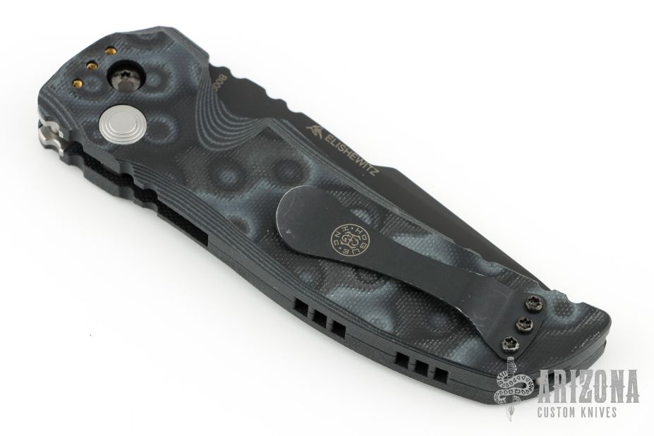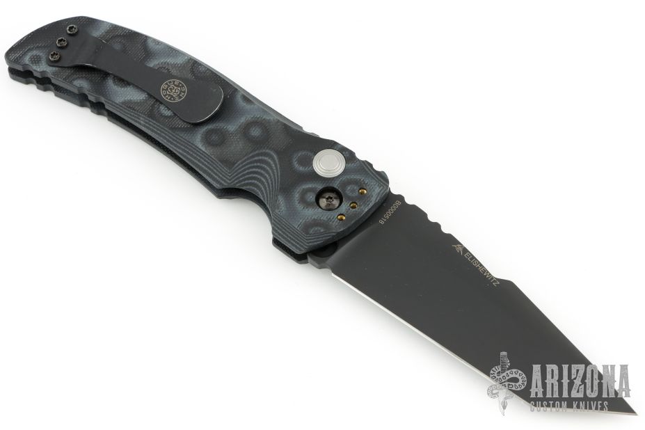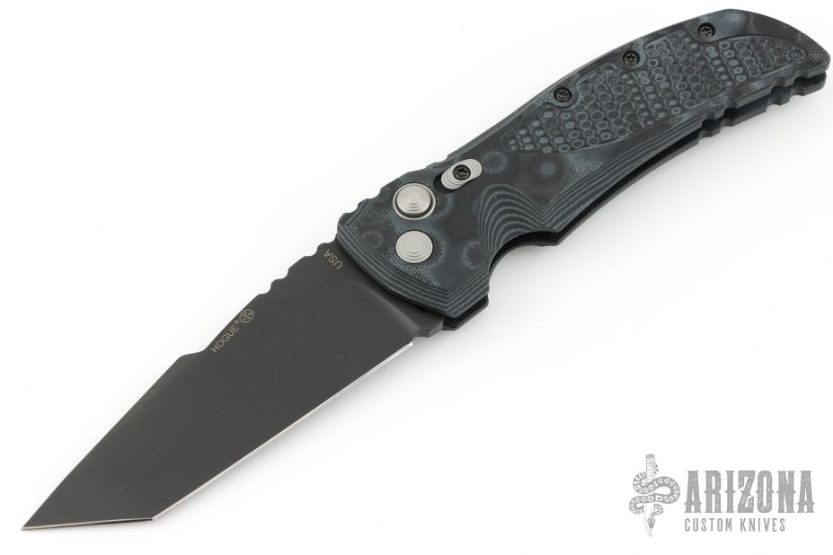 This Auto by Hogue features a black tanto blade with notched thumbrest. The handle is is black "G-Mascus" G-10, tip up or down reversible black stainless steel clip. Has safety. Has some light scuffs and scratches, great condition otherwise.