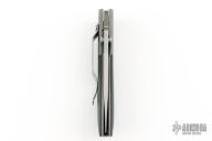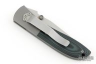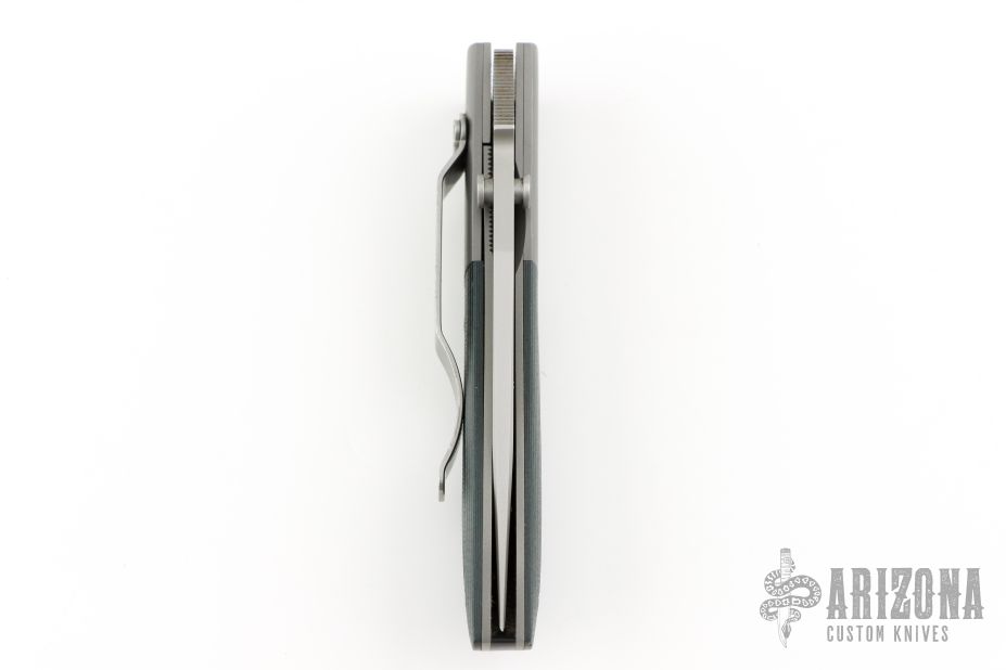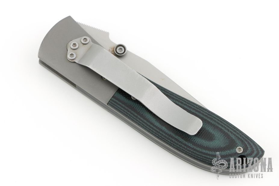 This Small Model 4 by Kit Carson features a finely bead blasted clip point blade with dual thumbstuds and notched thumbrest. The handle has bead blast finished titanium bolsters, grey/black G-10 scales, bead blasted titanium liners and a black backspacer. Tip down bead blasted stainless clip. Nice function, strong lock up, detent, and blade seating is dead center. Has a couple light scratches, otherwise excellent condition.