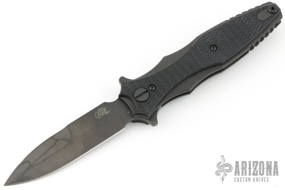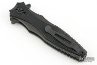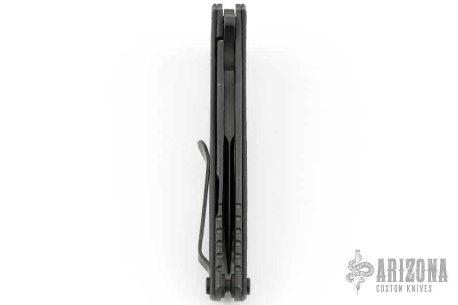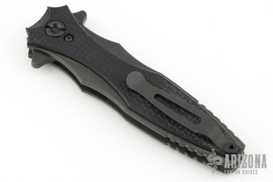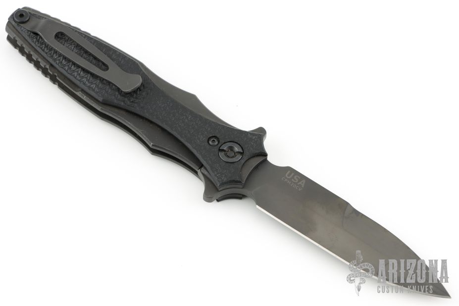 This Maximus by Hinderer Knives features a Battle Black bayonet style blade with flipper. The handle has a textured black G-10 over Battle Black titanium liners and tip up clip is reversible for right or left hand carry. Great blade seating, detent and lock up. Has some scuffs, scratches, and stains on the blade. Great condition otherwise.
