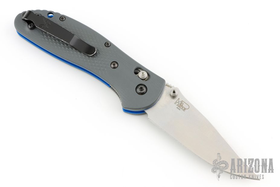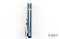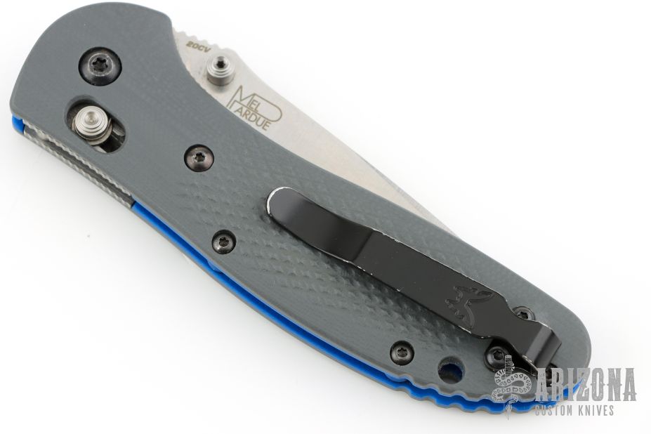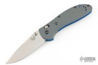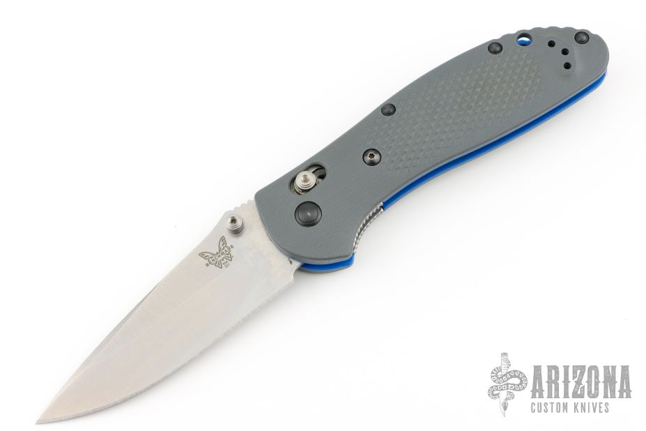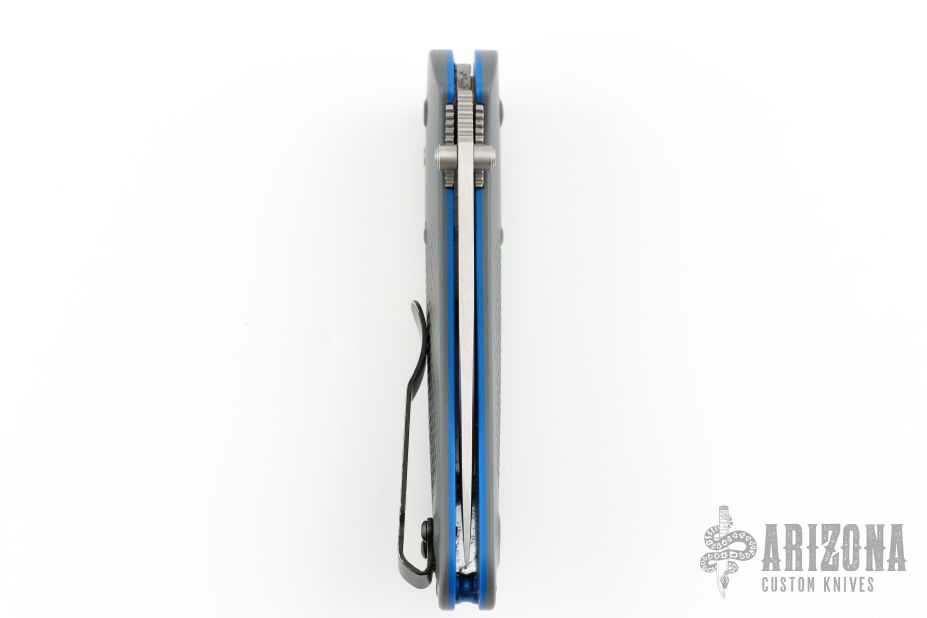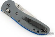 This Griptilian 551-1 by Benchmade features a stonewashed blade with swedge, notched thumbrest and dual thumbstuds. The handle has textured grey G-10 scales with blue G-10 liners, blue anodized barrel spacers. The pocket clip can be reversed for right or left tip up carry. The AXIS lock system makes the knife easy to open and easy to close. Comes with original box and papers. Excellent condition.